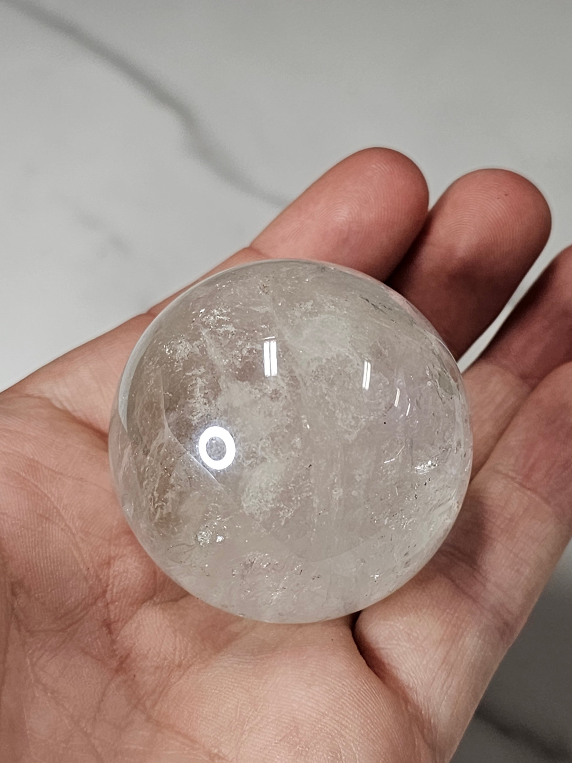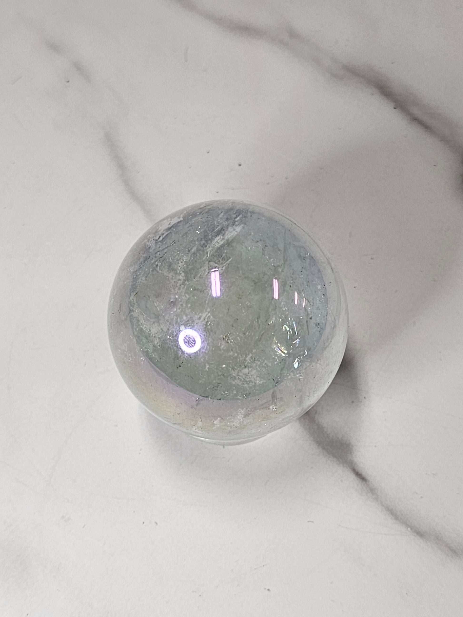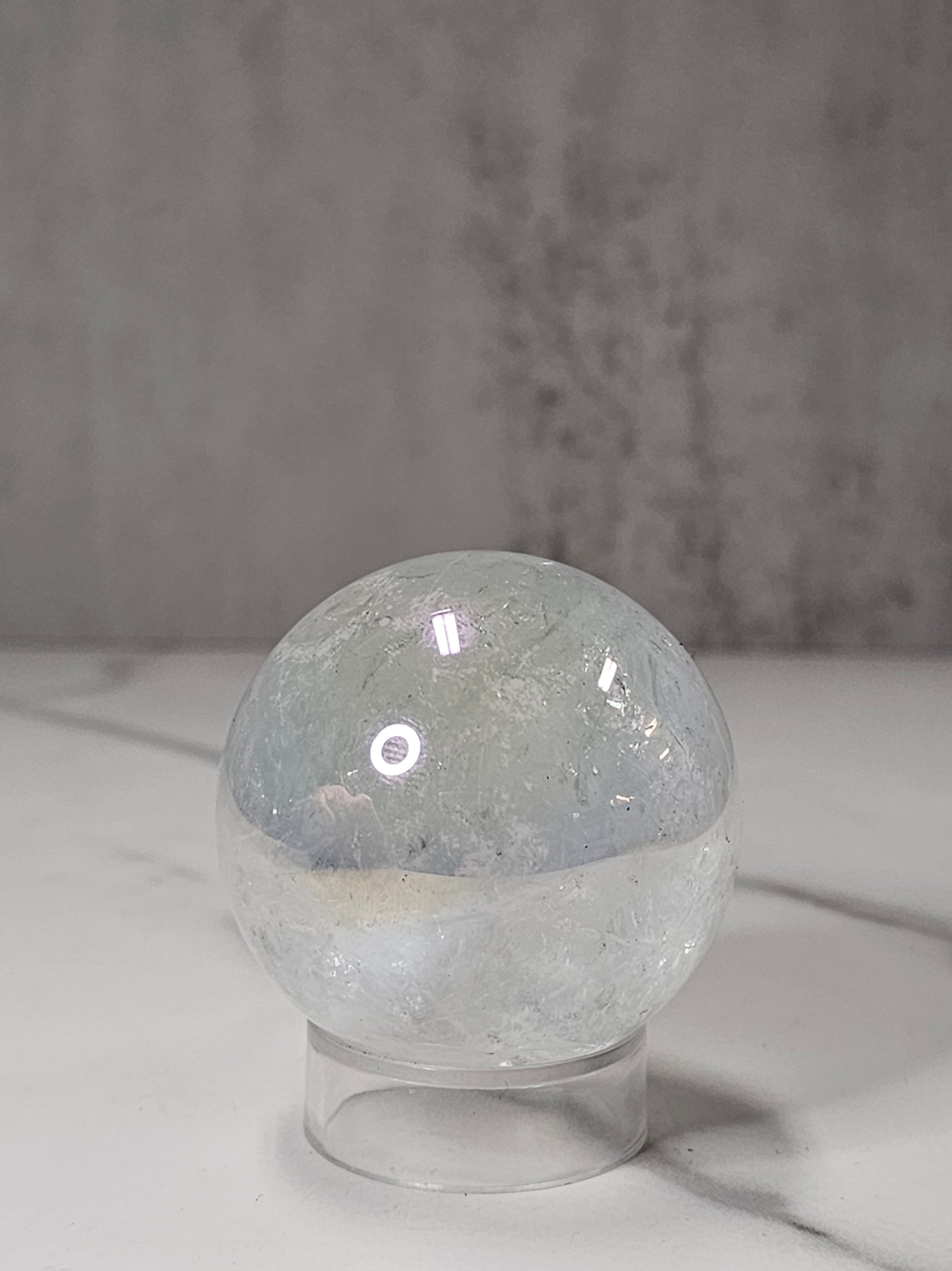 This Aura Quartz sphere is extremely clear and translucent. It's a stunning specimen. The exact crystal pictured is the one you will receive.