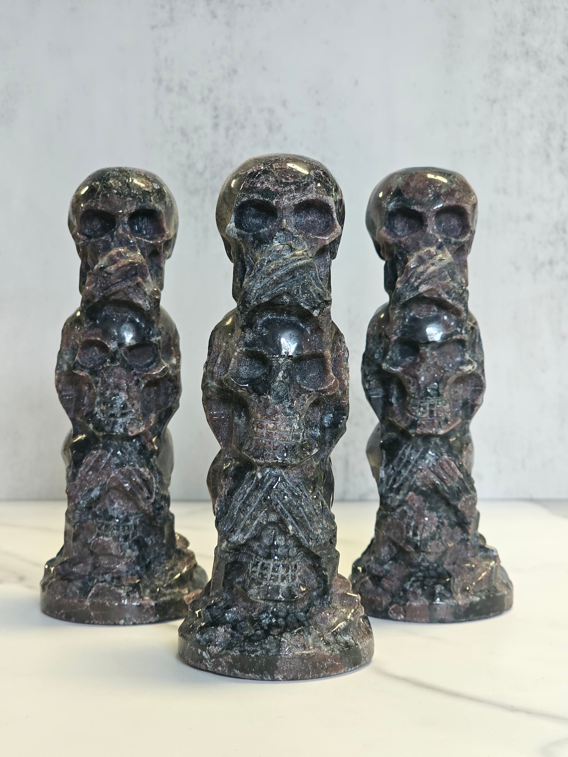 These Garnet carvings stand 6 inches tall and feature three skulls stacked on top of each other representing the old adage " Speak no evil, hear no evil, see no evil."