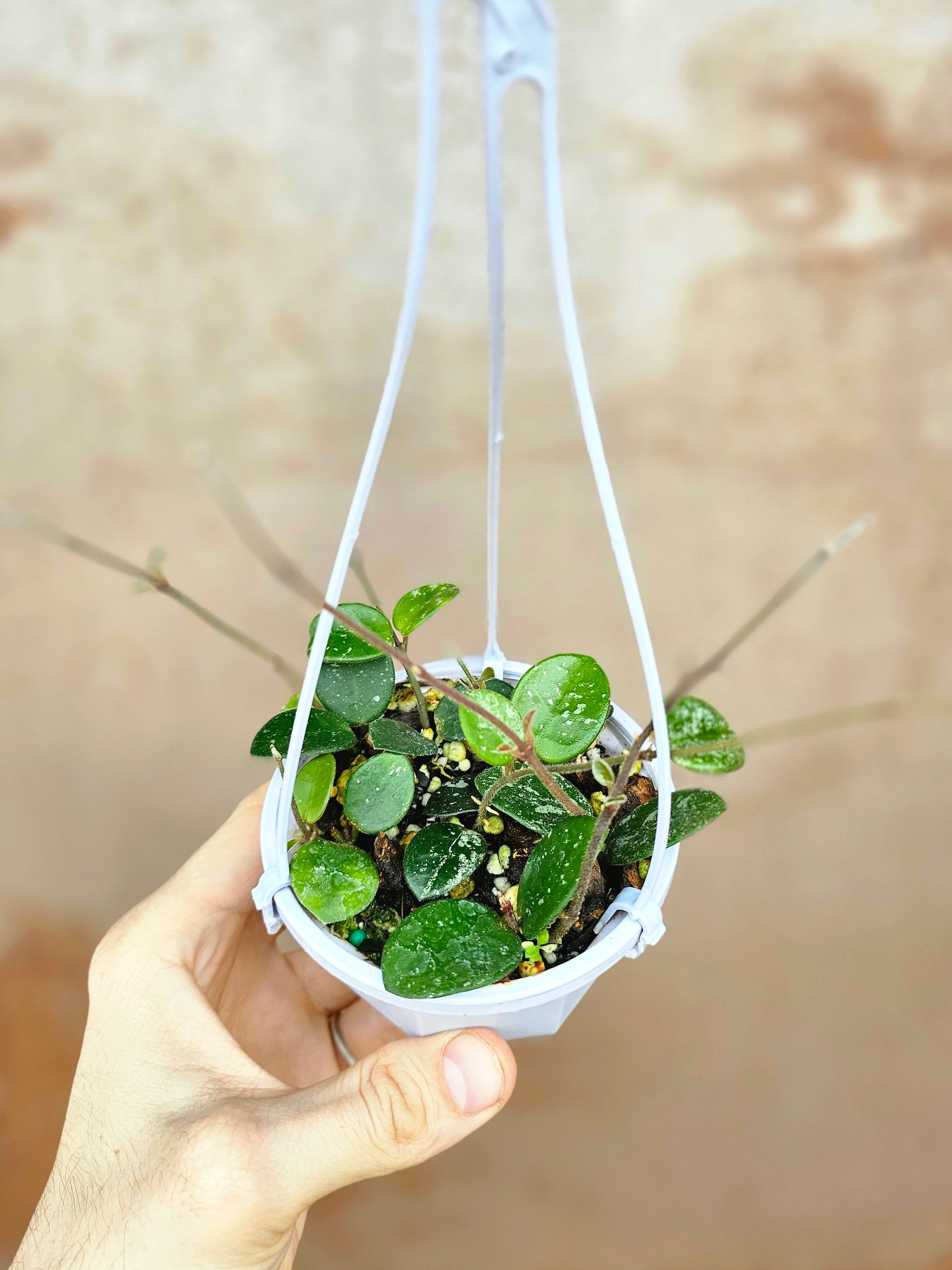 This Hoya is a hybrid of Hoya carnosa x serpens. These Hoyas are fully rooted and growing in our QB Aroid & Hoya potting mix in mini 4" white plastic hanging baskets. They're already beginning to trail. Excellent splash on the small Hoya leaves.