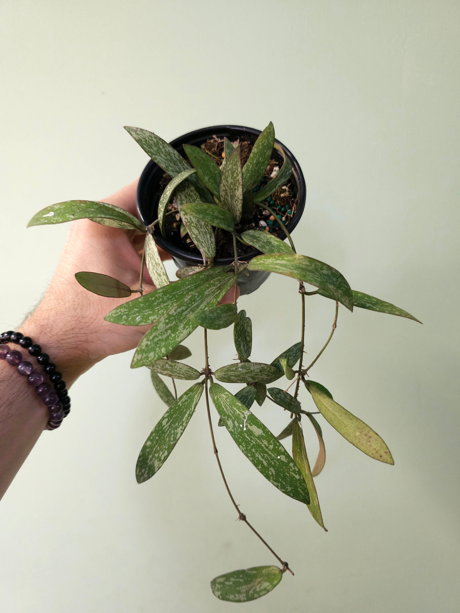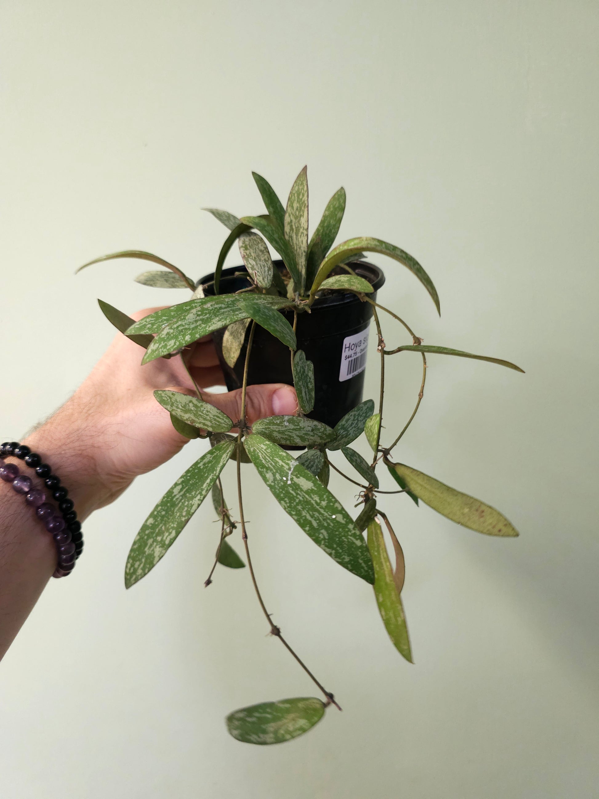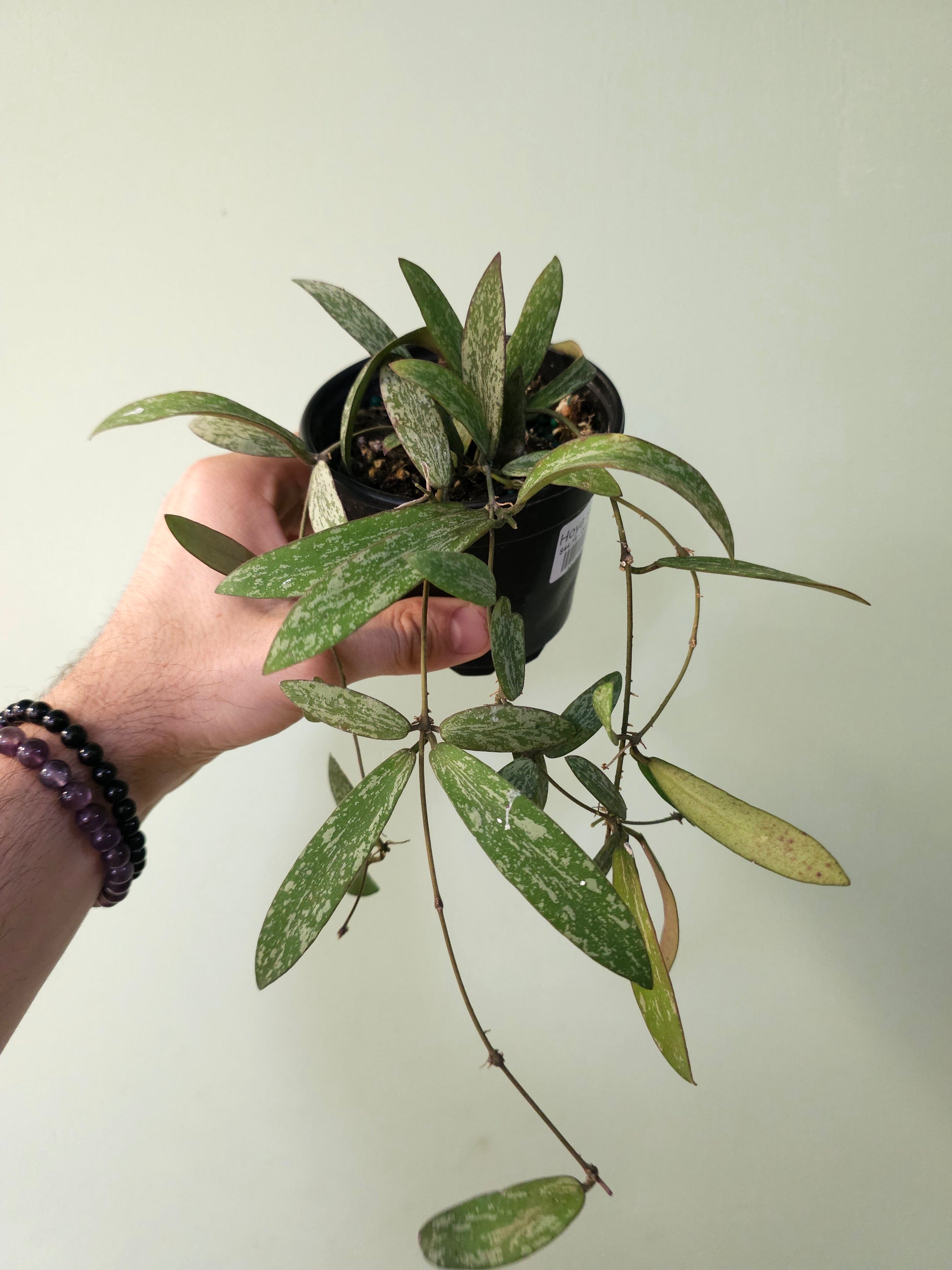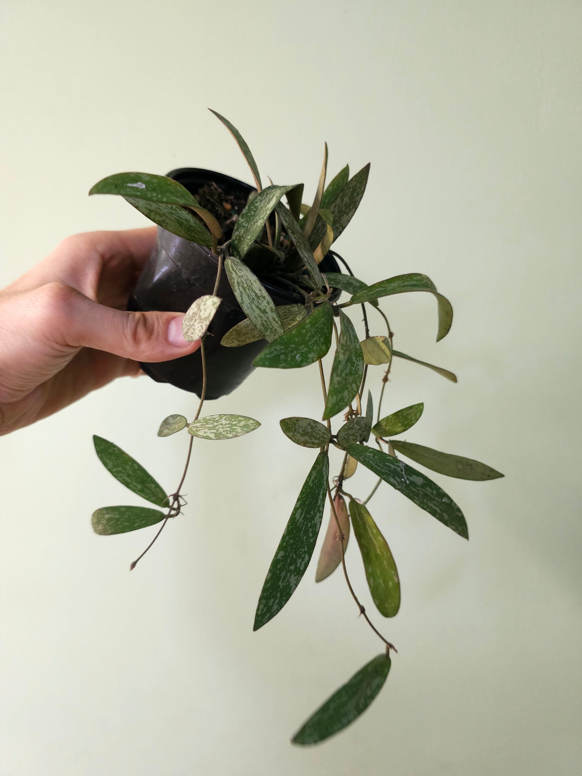 These Hoyas have super splashy leaves and they're fully rooted in a 4" nursery pot and just beginning to trail out.