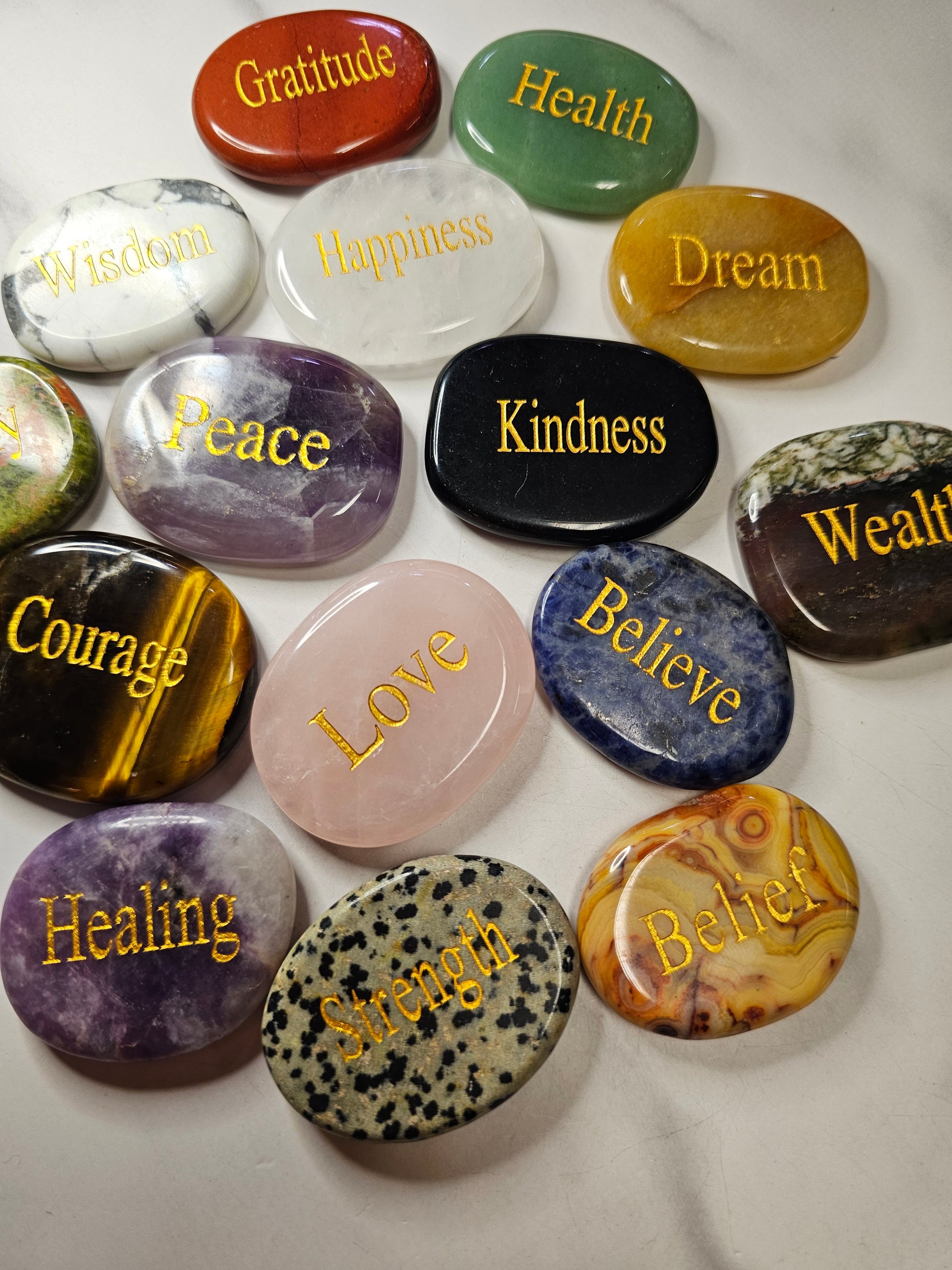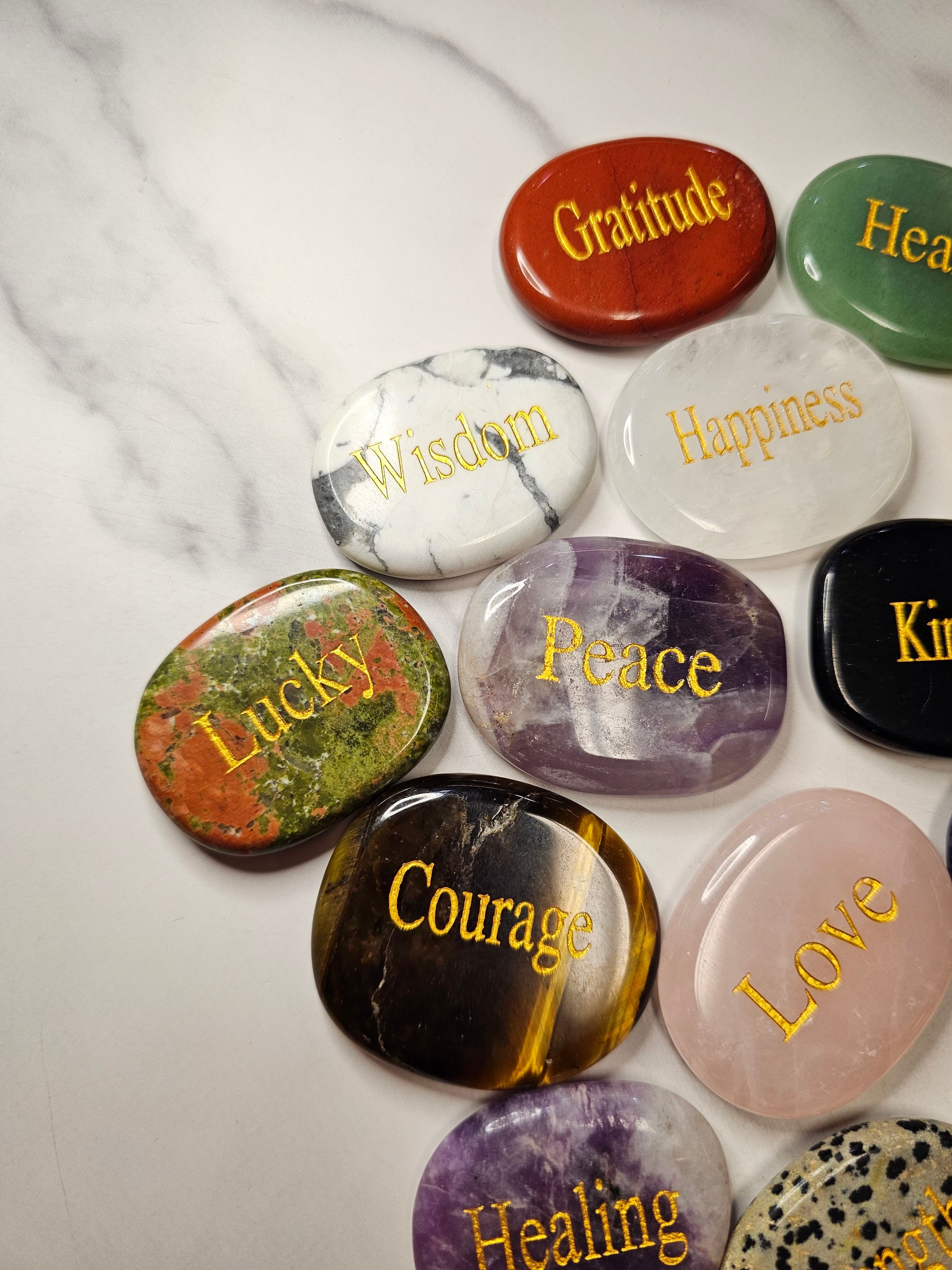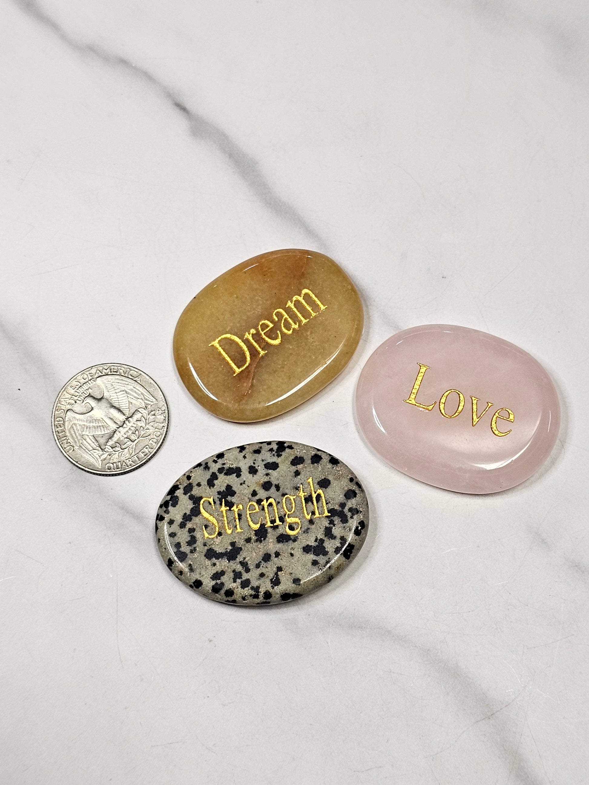These crystals are polished to perfection and have intentions engraved on them in gold writing. These make excellent gifts, or carry one around daily to manifest what you need. These are approximately 1.75x1.5 inches in size.