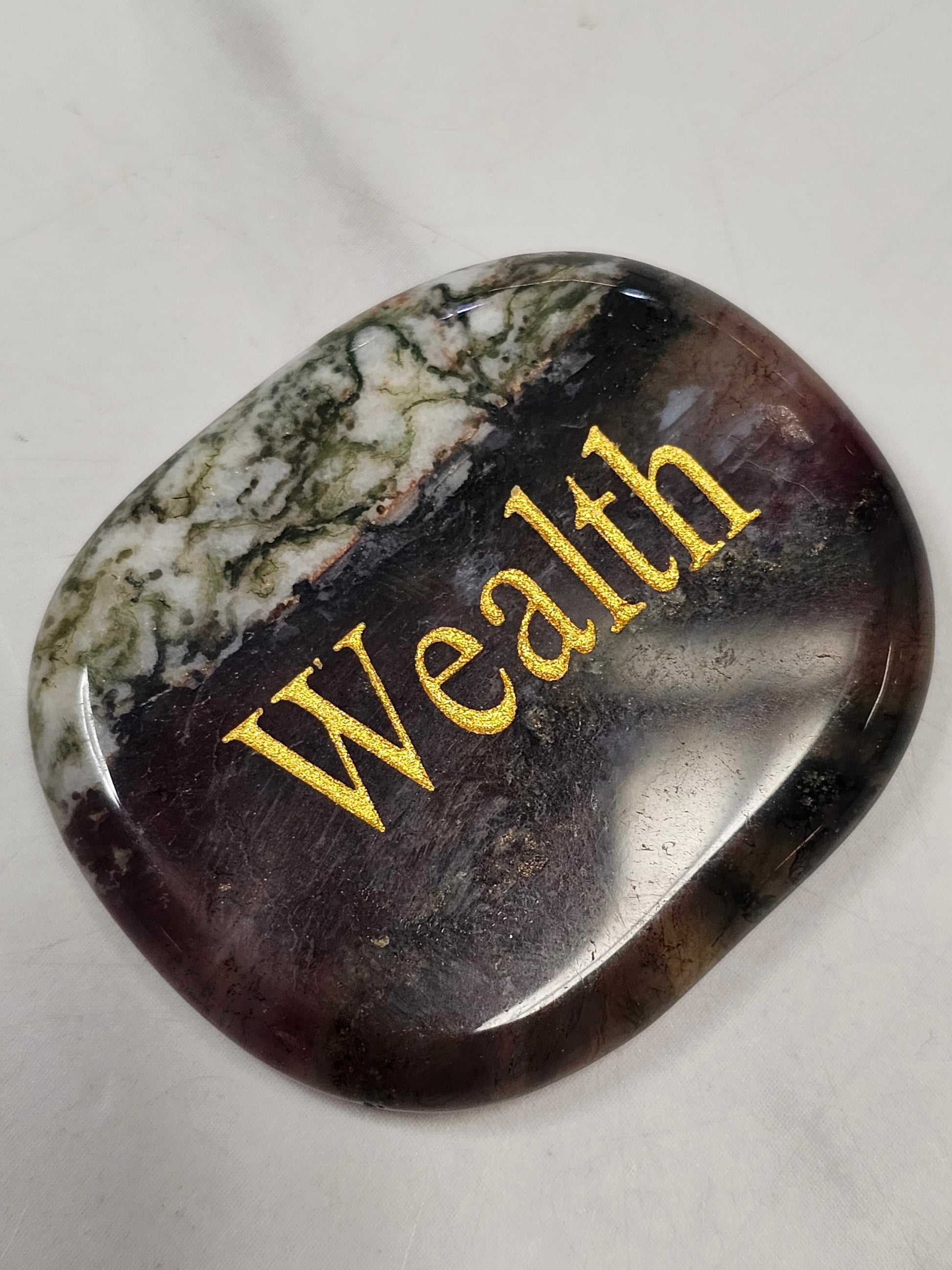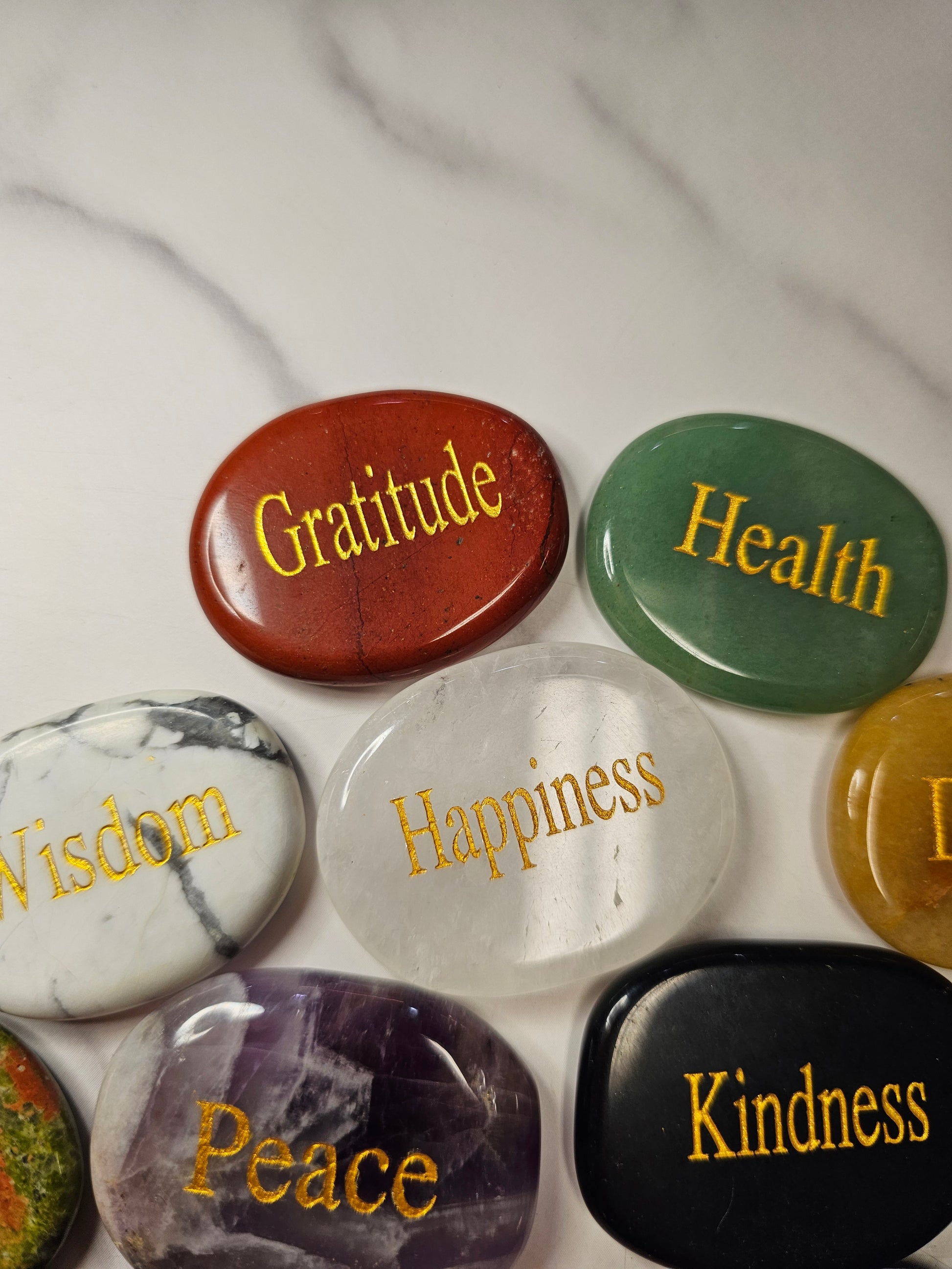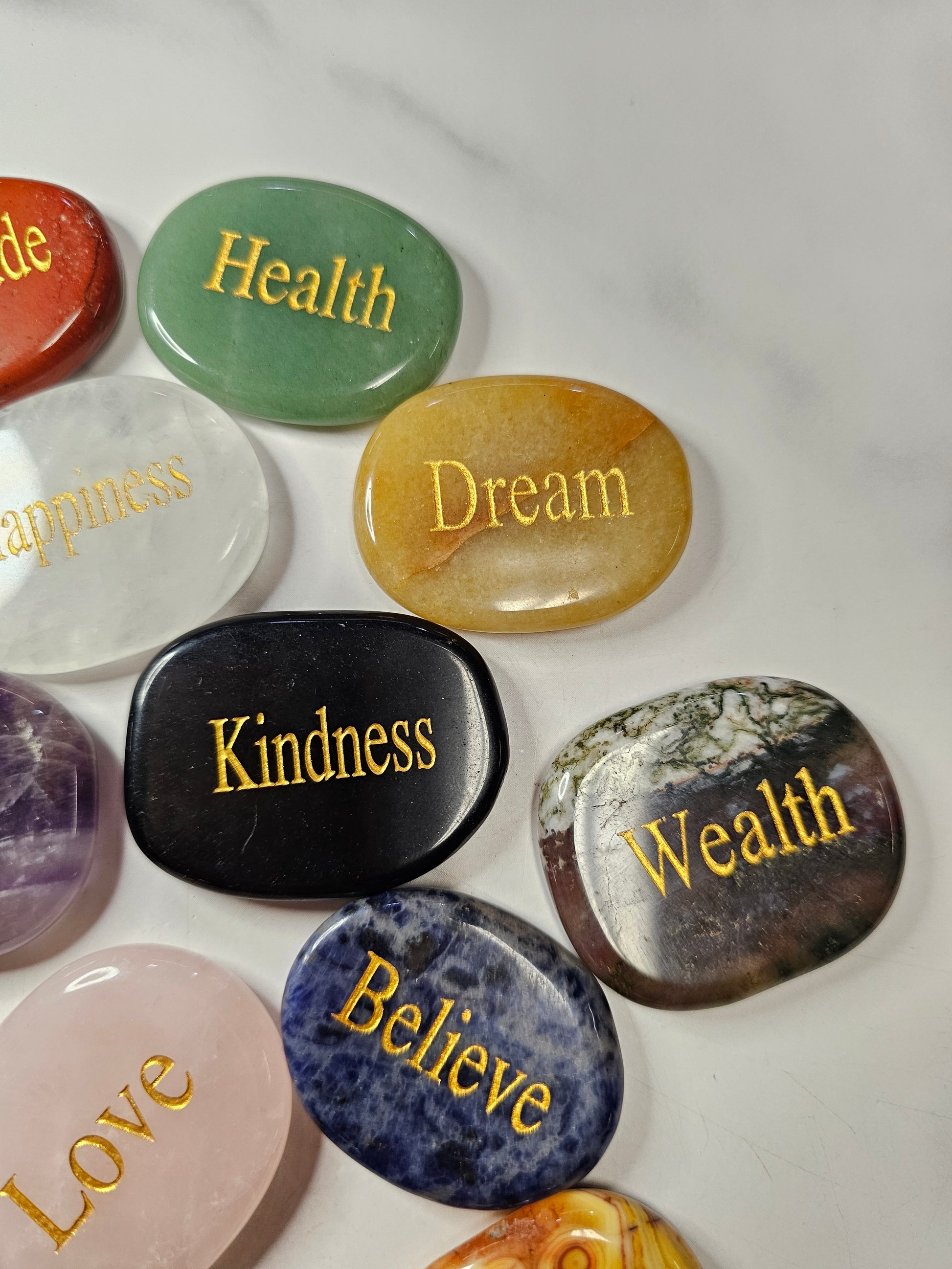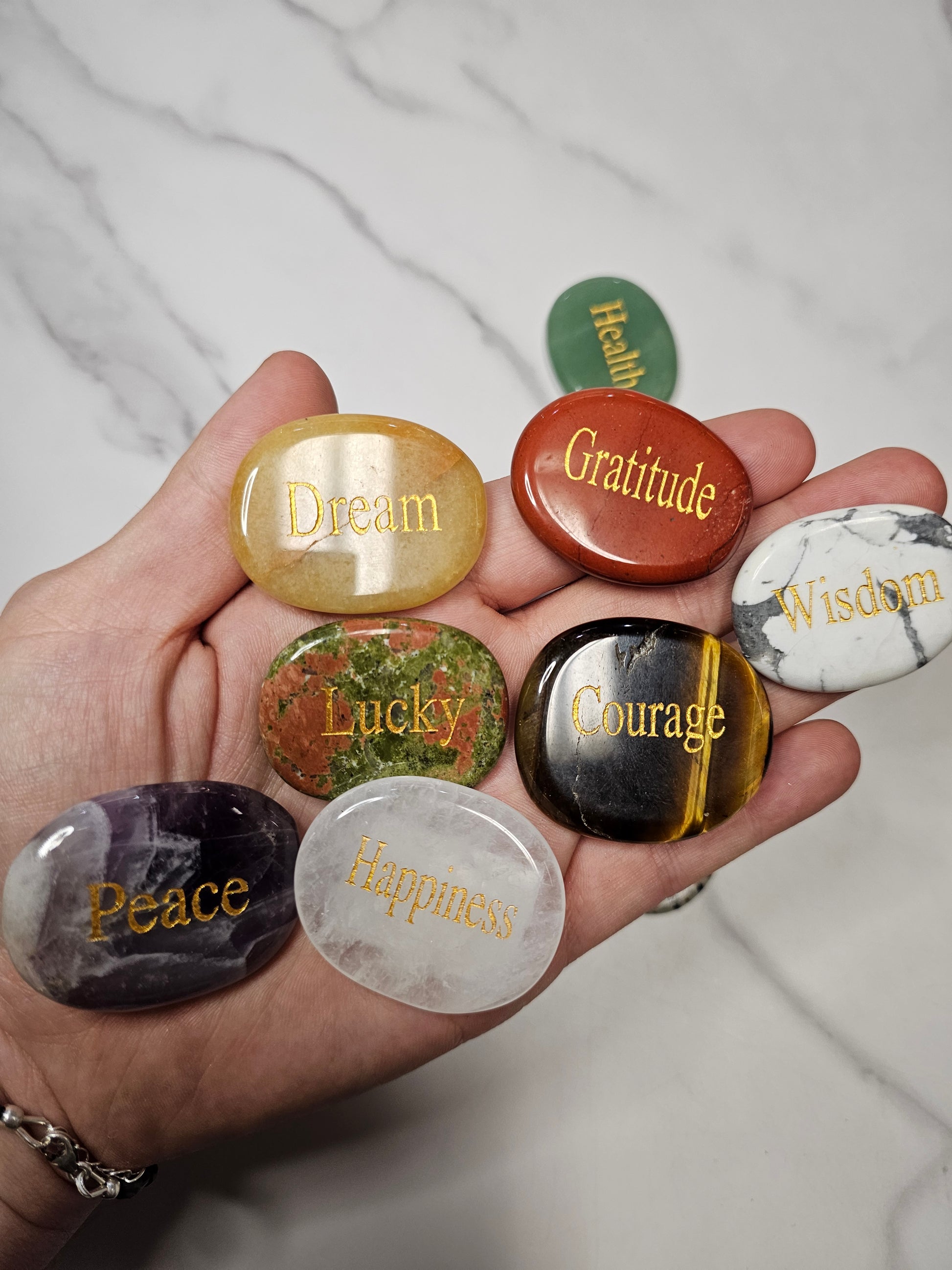These crystals are polished to perfection and have intentions engraved on them in gold writing. These make excellent gifts, or carry one around daily to manifest what you need. These are approximately 1.75x1.5 inches in size.