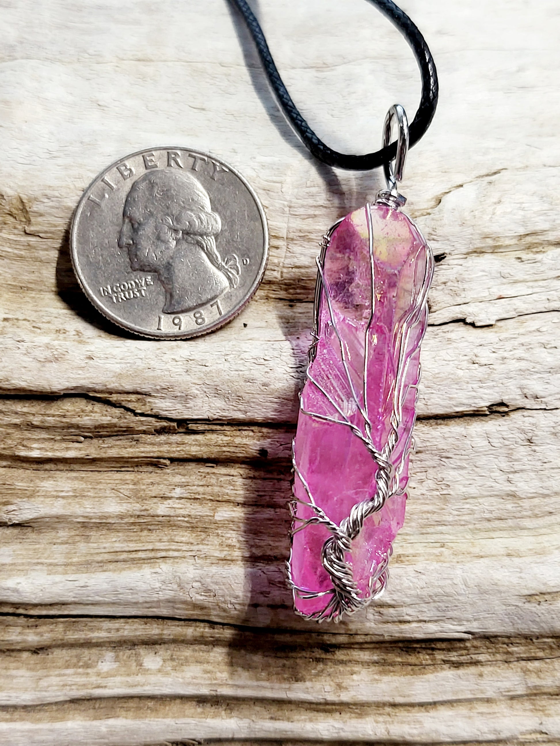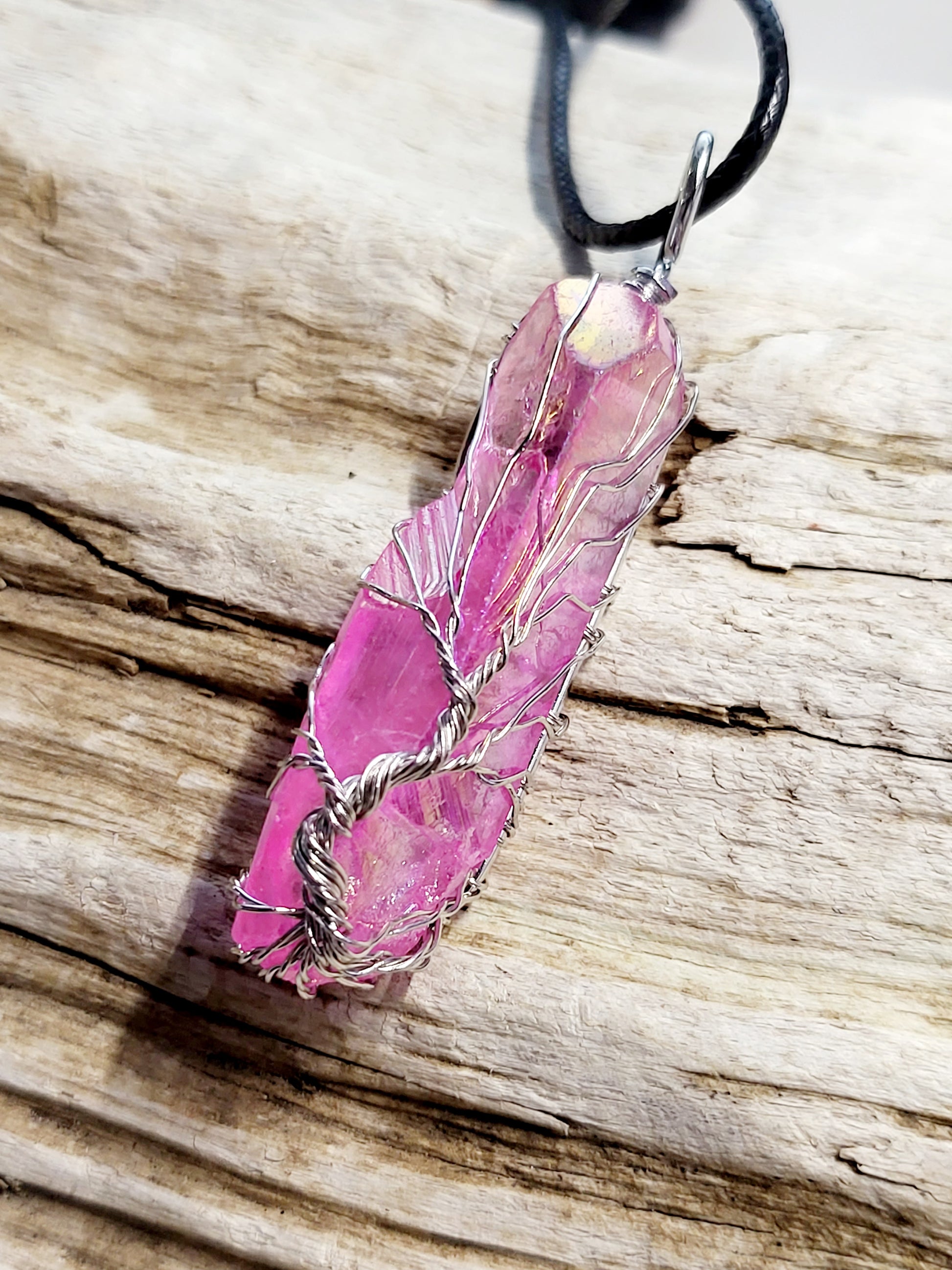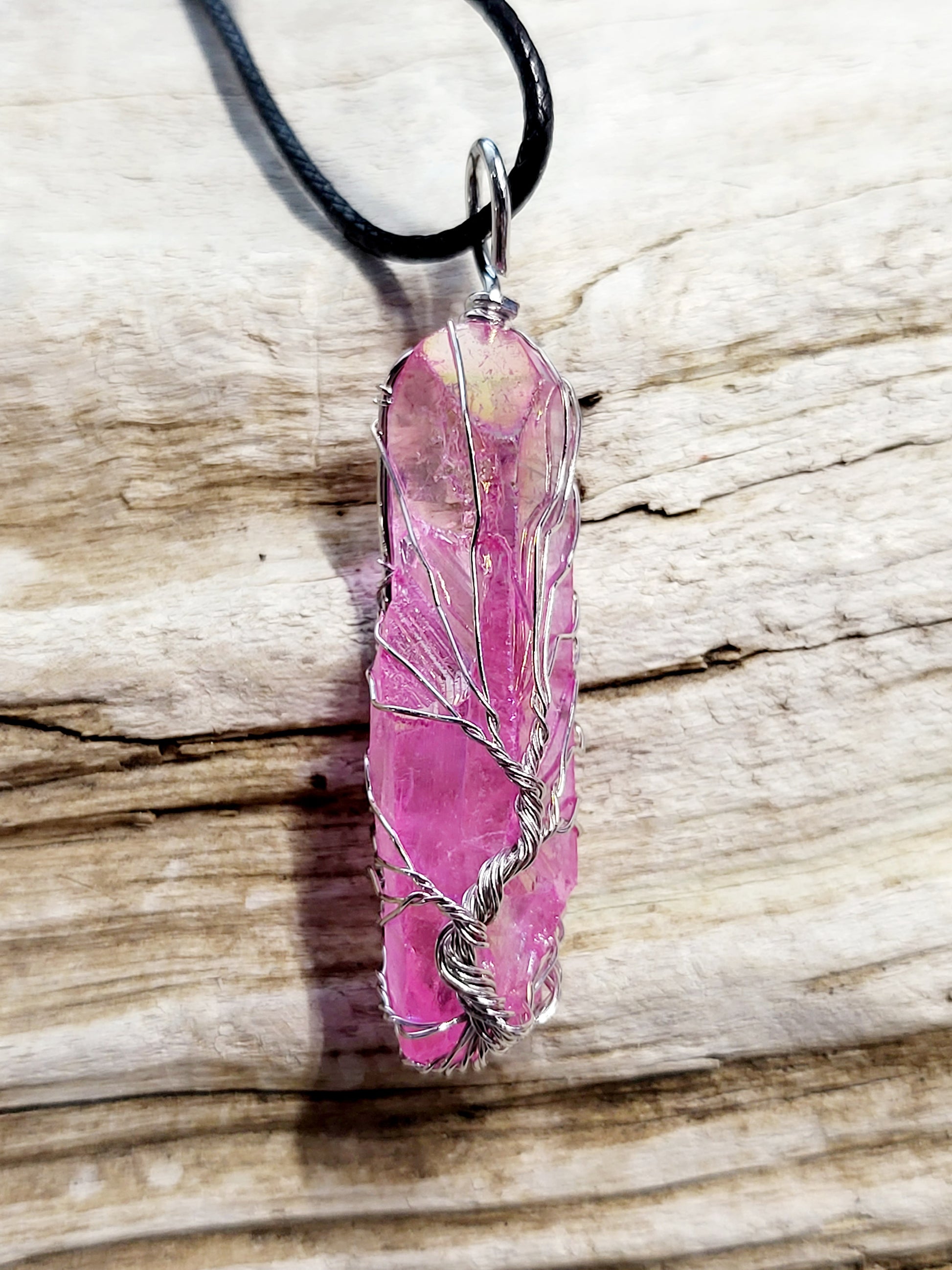 This pink Quartz point has been wrapped with silver wire in a Tree of Life design. It comes on an 18" black waxed cord with metal clasps. The necklace you will receive is not the exact one pictured but will be very similar in size.