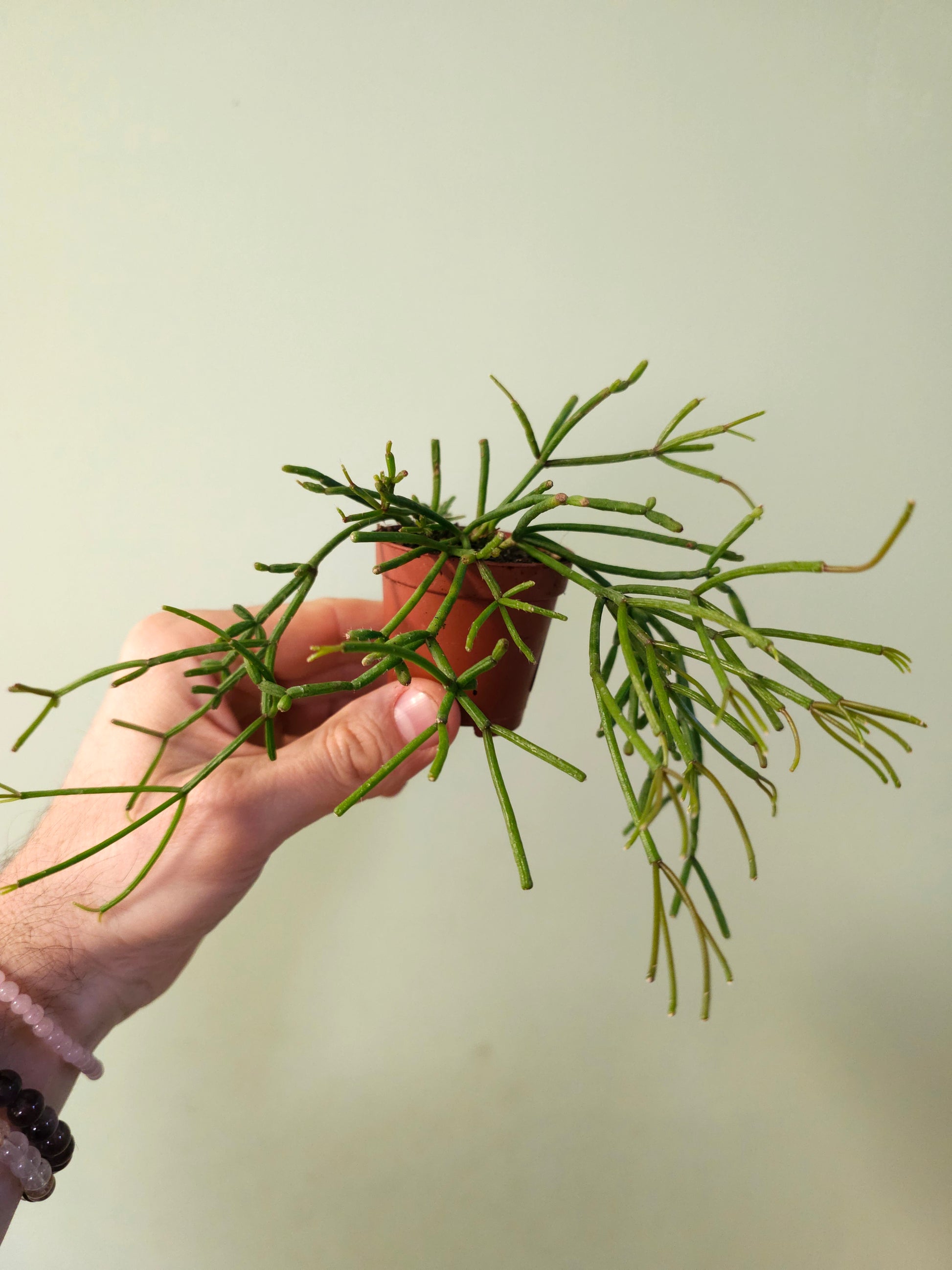 Rhipsalis are a genus of epiphytic cacti. Epiphytic cacti are jungle cacti that use another plant, typically a tree, for support. You'll find these naturally growing in the crooks of tree branches where leaf litter and moss has built up, using their roots to attach to the trees bark. Rhipsalis pilocarpa is native to South America, specifically the Brazilian Rain Forests.