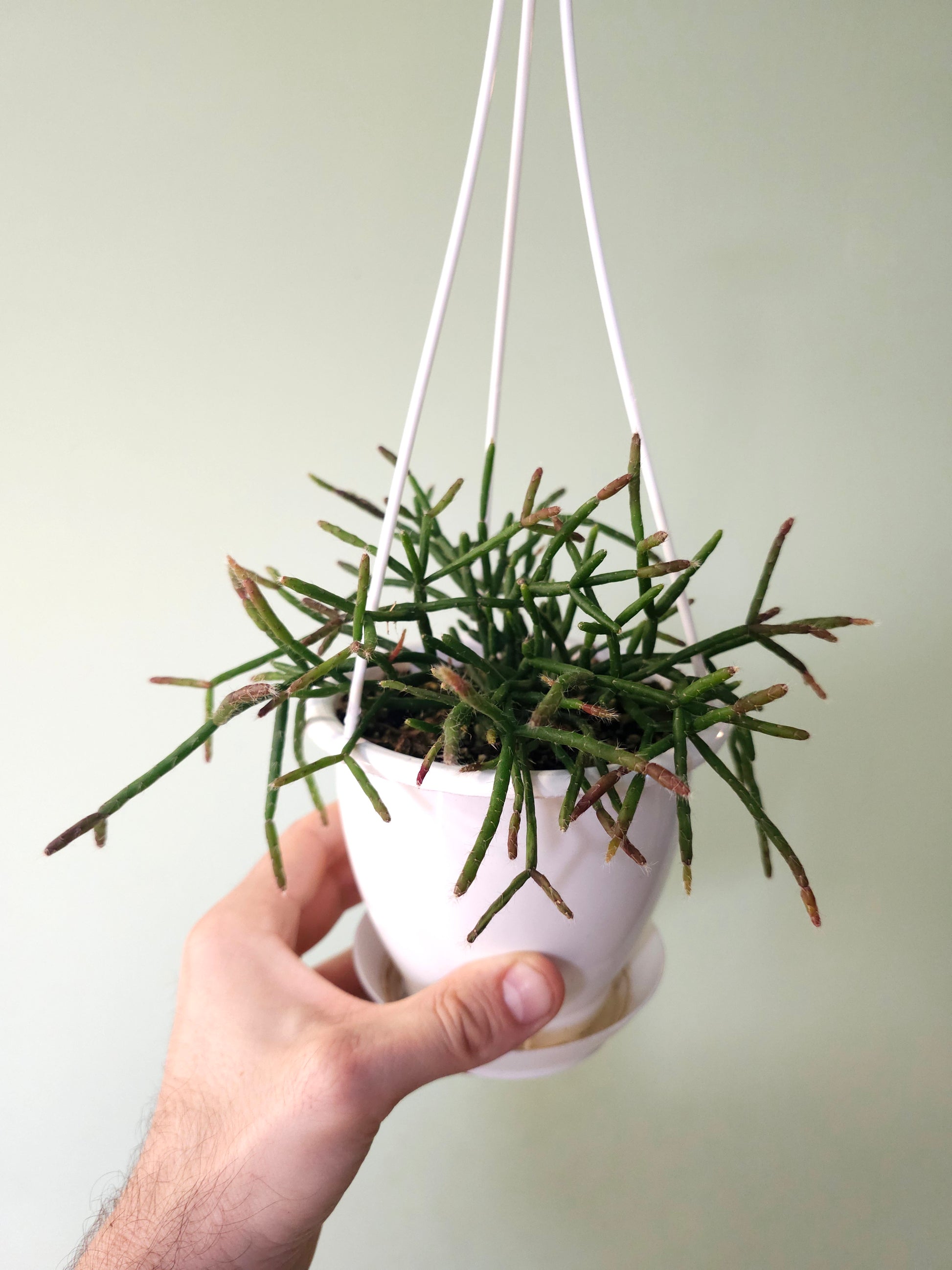 These Rhipsalis are growing in 4.5" white plastic hanging baskets with removeable saucers. They're fully rooted and already beginning to trail. These are 100% QB grown in our hand mixed living soil.