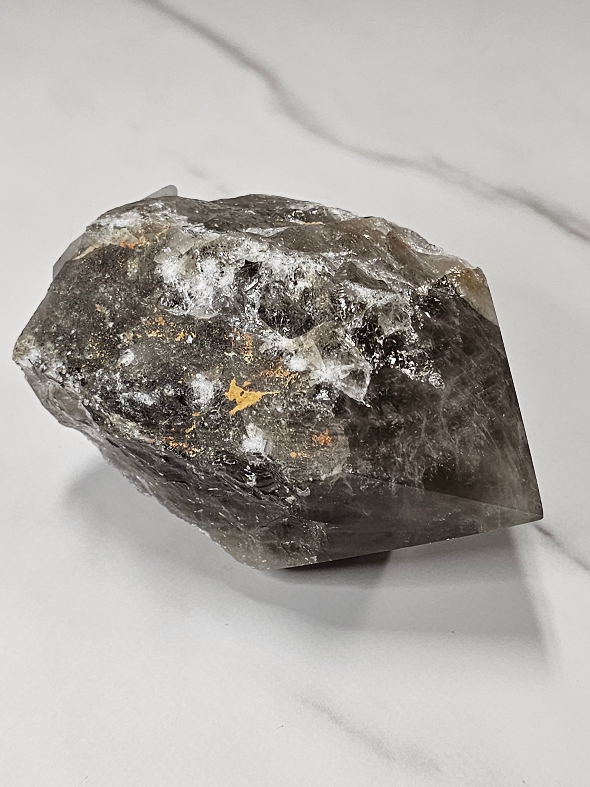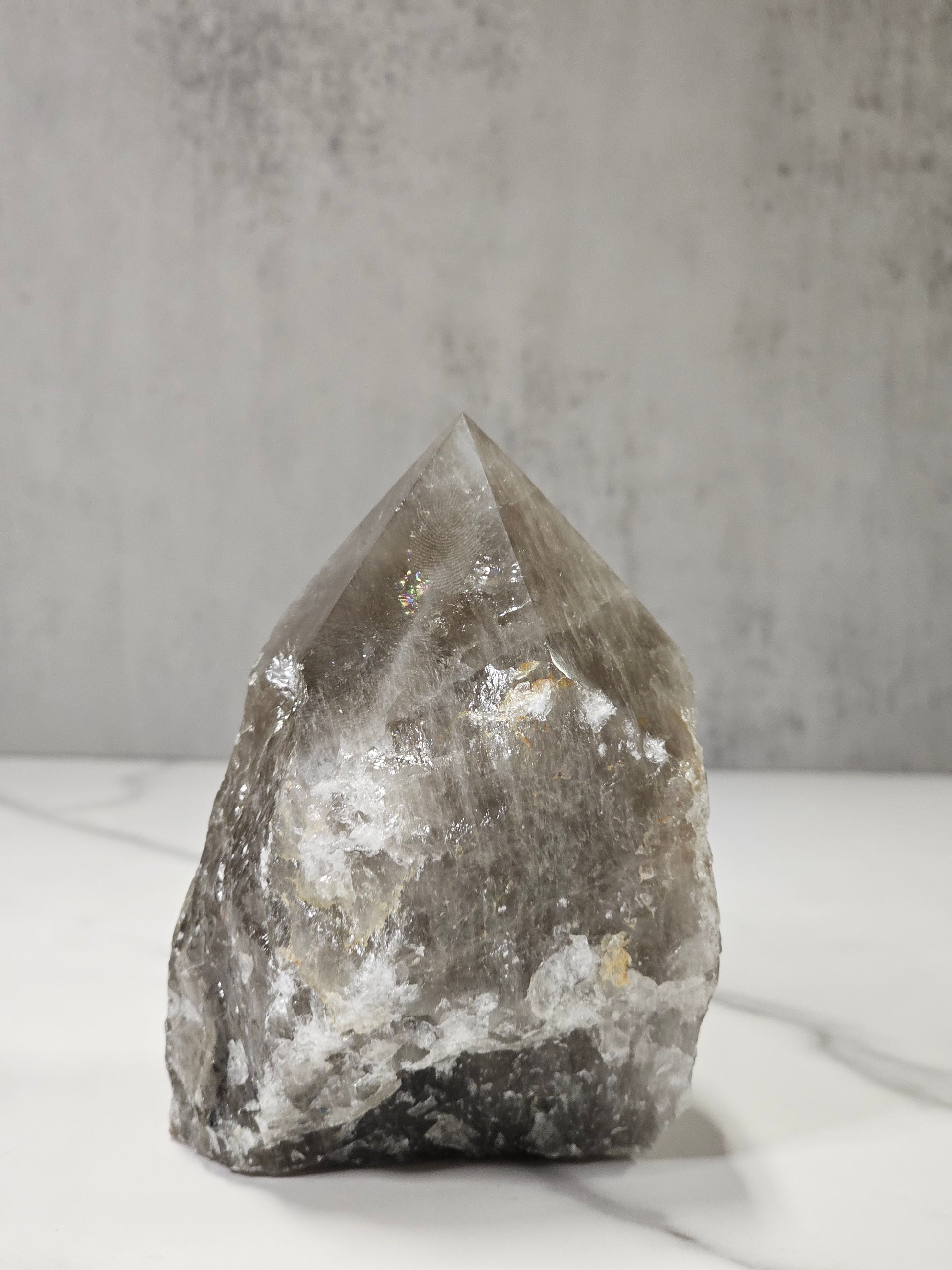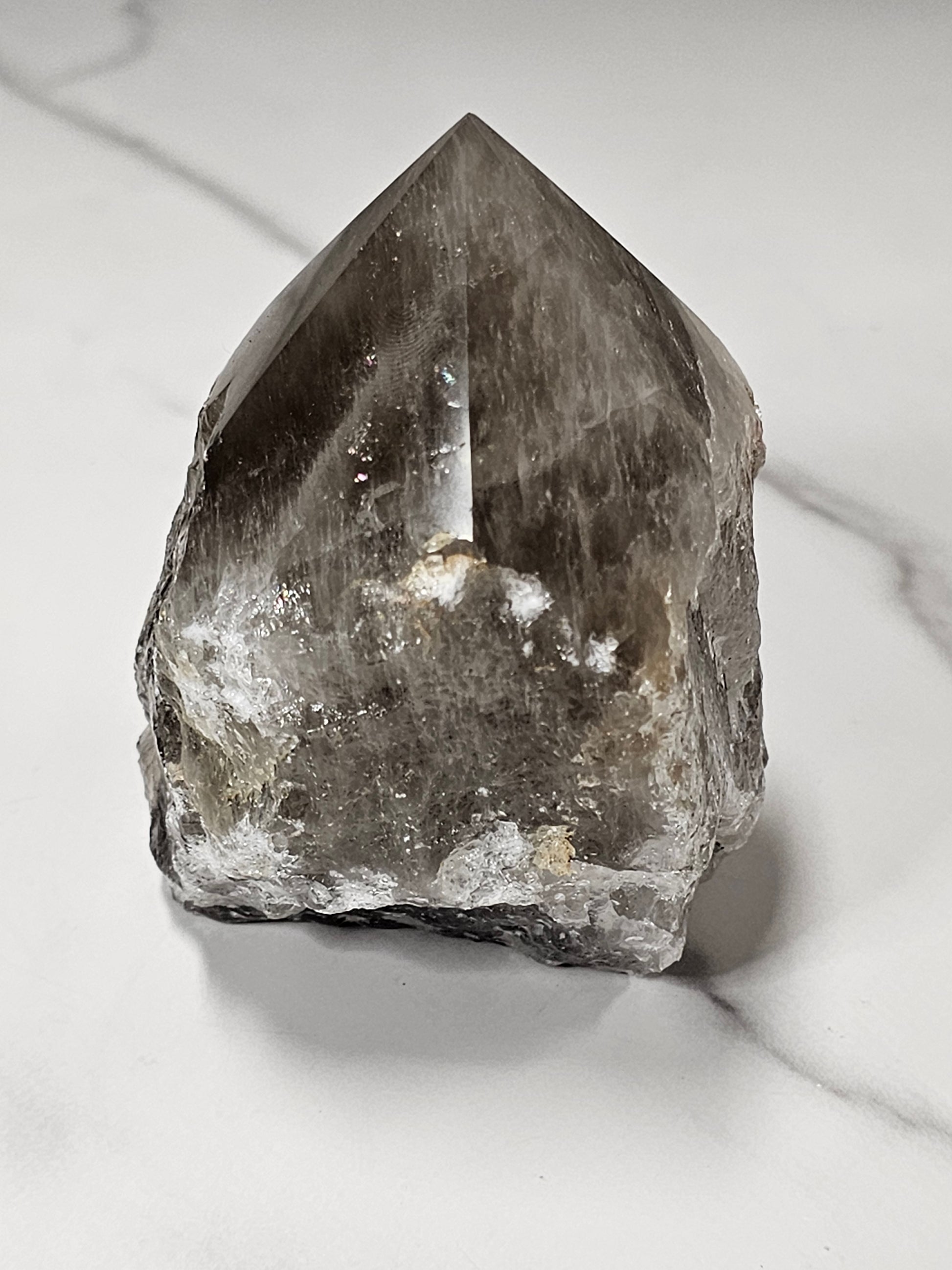 This is a really nice polished top Smokey Quartz piece. It weighs 18.4 ounces. It stands 3.75 inches tall and is 2.81 inches at the widest part. This one has a really nice dark color to it.