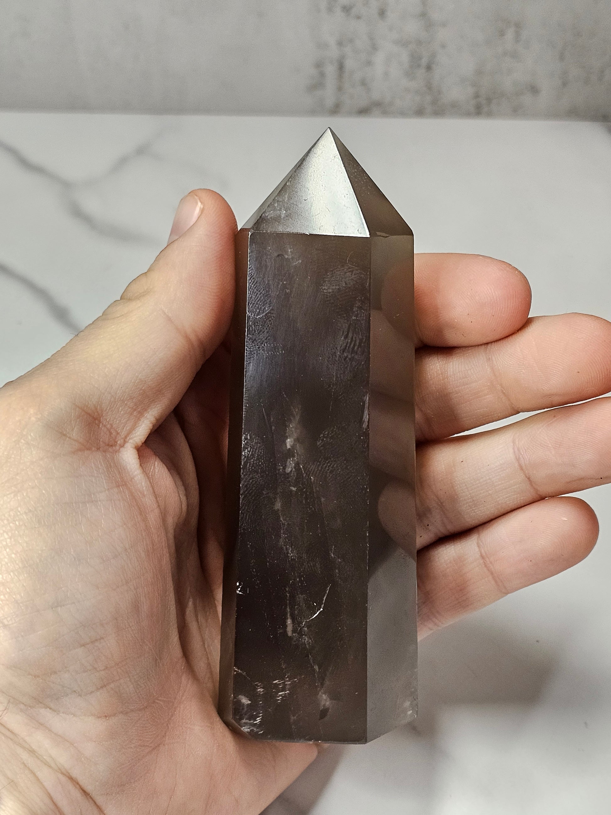 This Smokey Quartz Tower has a nice medium tone hue to it. It stands 4.64 inches tall and is 1.64 inches wide at the base. It weighs 8.9 ounces. The exact crystal pictured is the one you will receive.