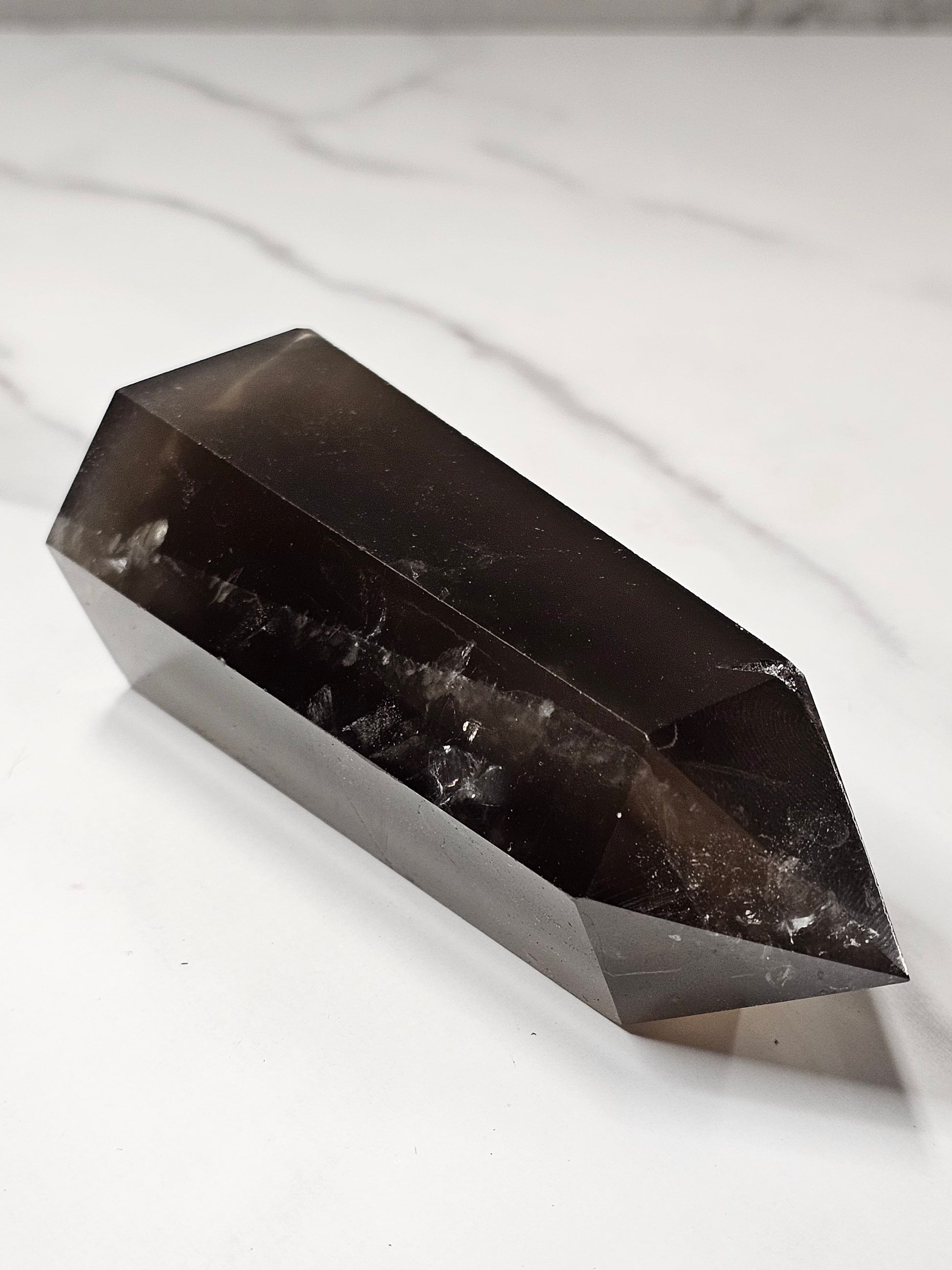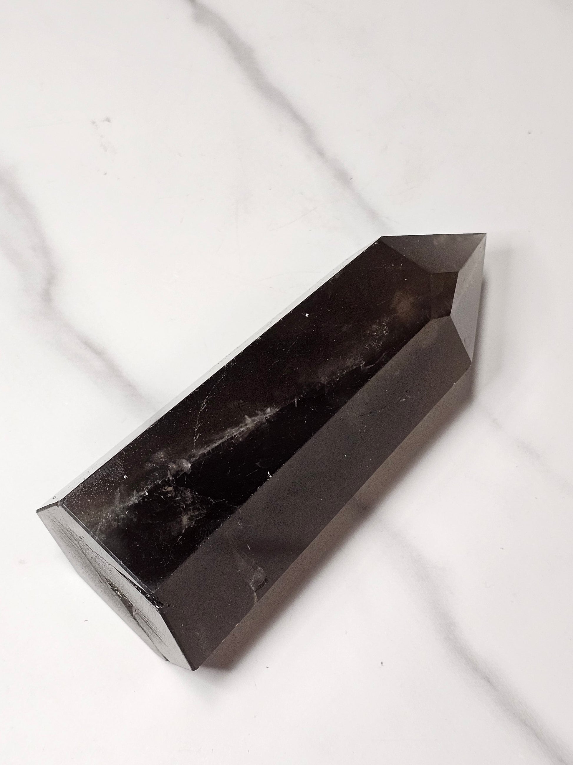 This Smokey Quartz Tower has a nice medium tone hue to it with some lighter spots and some little flashes of rainbow. It stands 4.25 inches tall and is 1.82 inches wide at the base. It weighs 9.0 ounces. The exact crystal pictured is the one you will receive.