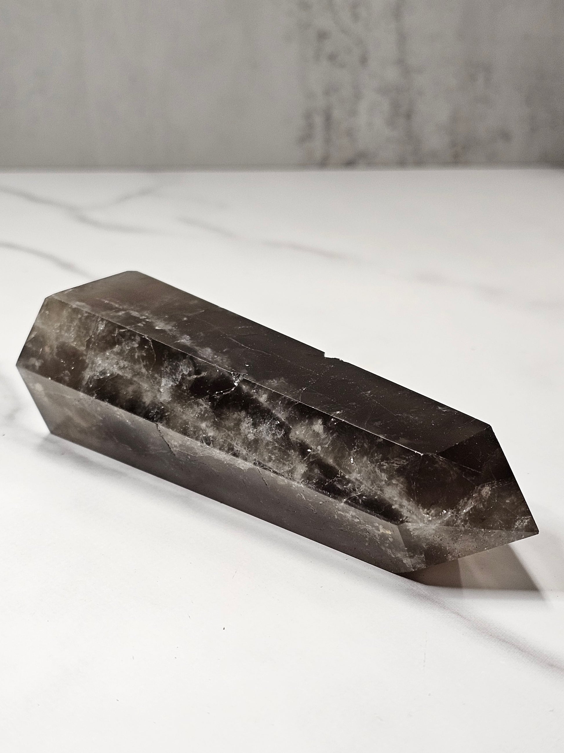 This Smokey Quartz Tower has a nice medium tone hue to it with a lot of intricate detail inside. It stands 4.52 inches tall and is 1.56 inches wide at the base. It weighs 7.3 ounces. This tower does have some minor chips as can be seen in the photos. The exact crystal pictured is the one you will receive.