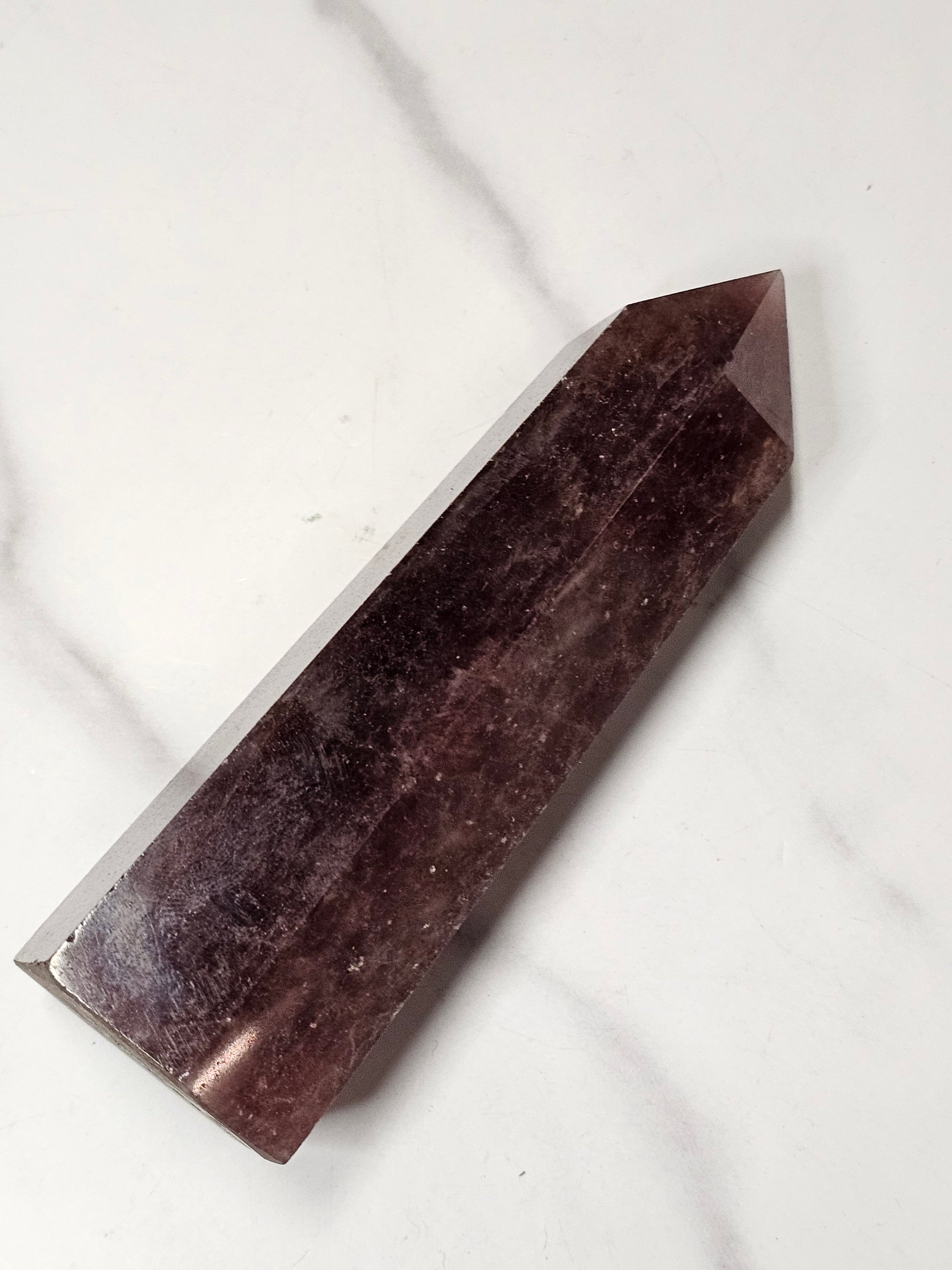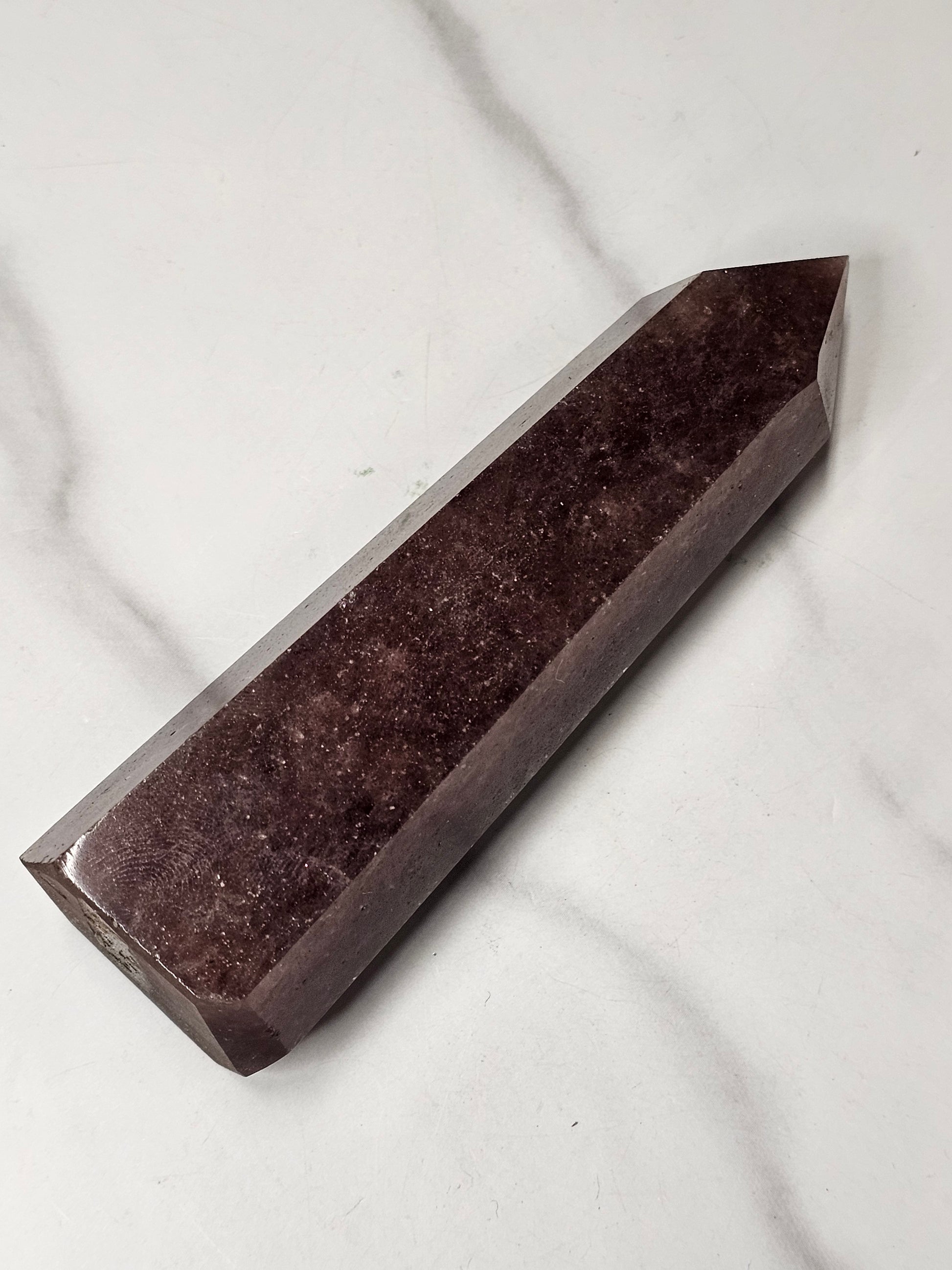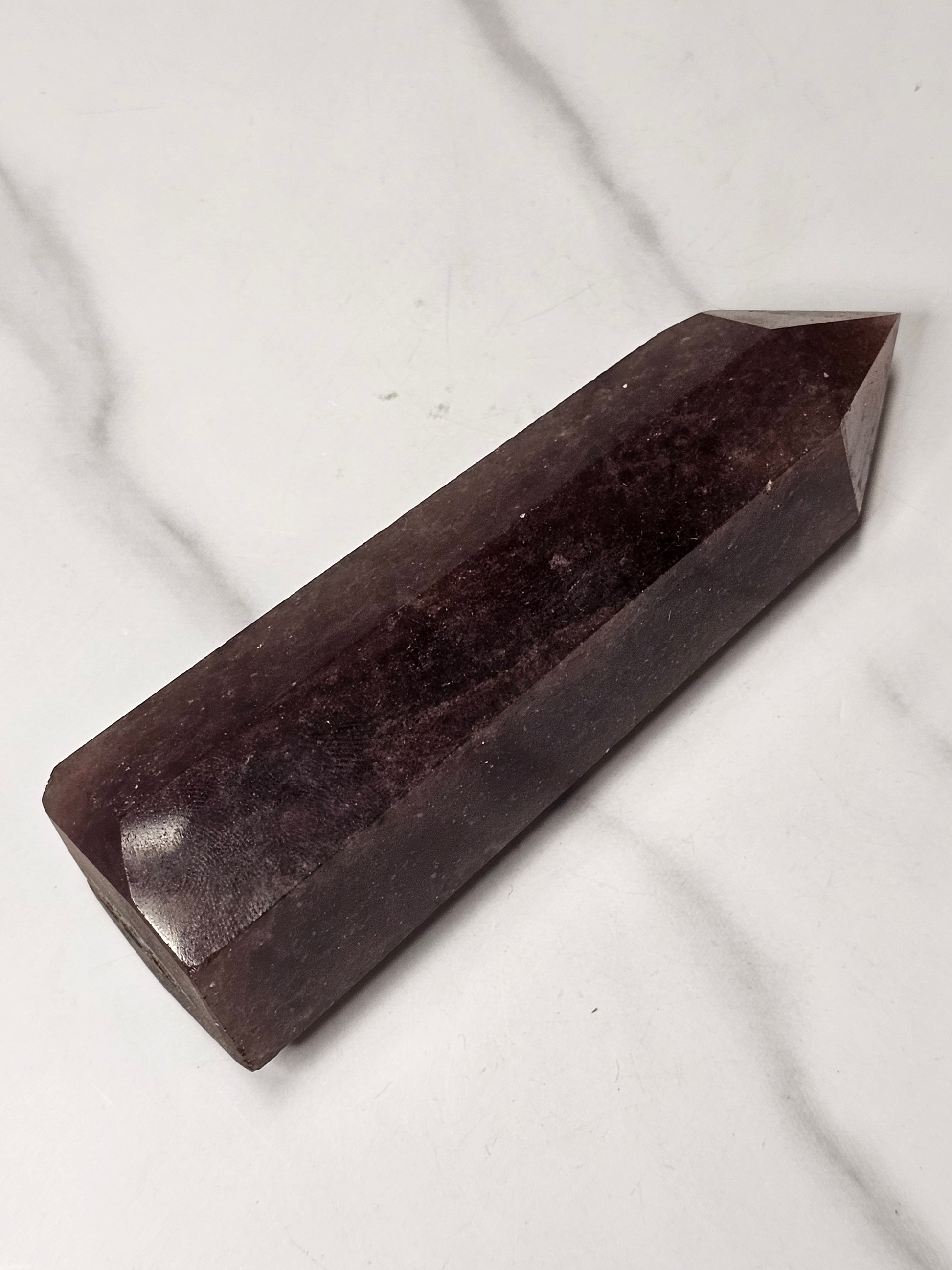 This Strawberry Quartz towers stands up at 4.41 inches tall. It has a base diameter of 1.47 inches wide.