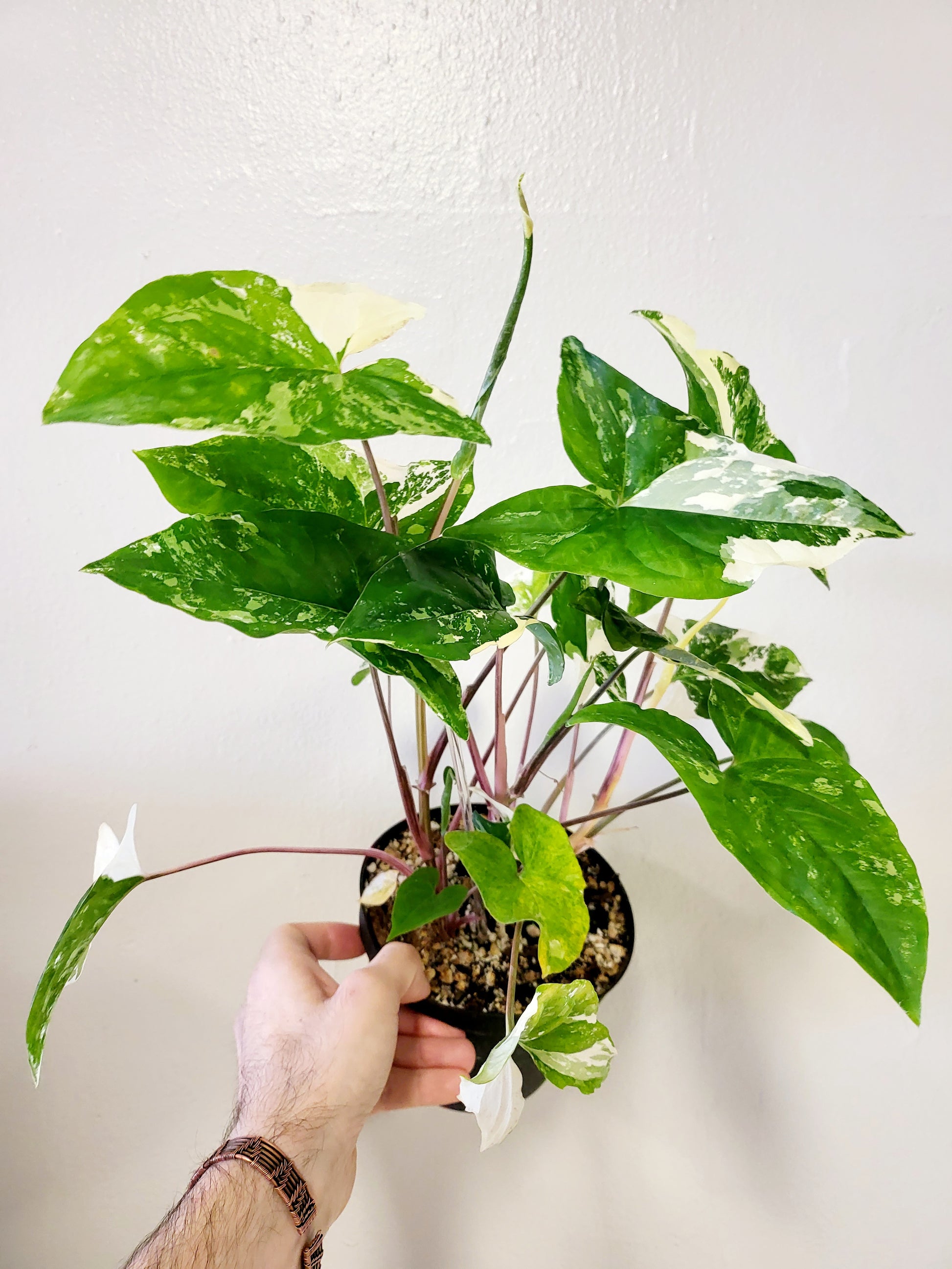 This extra large Albo Variegated Syngonium is growing and established in a 6" nursery pot. The exact plant pictured is the one you will receive.