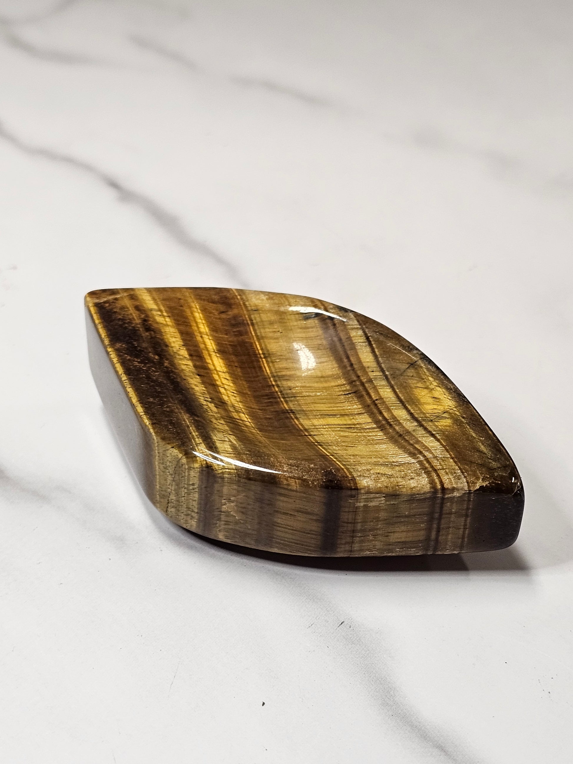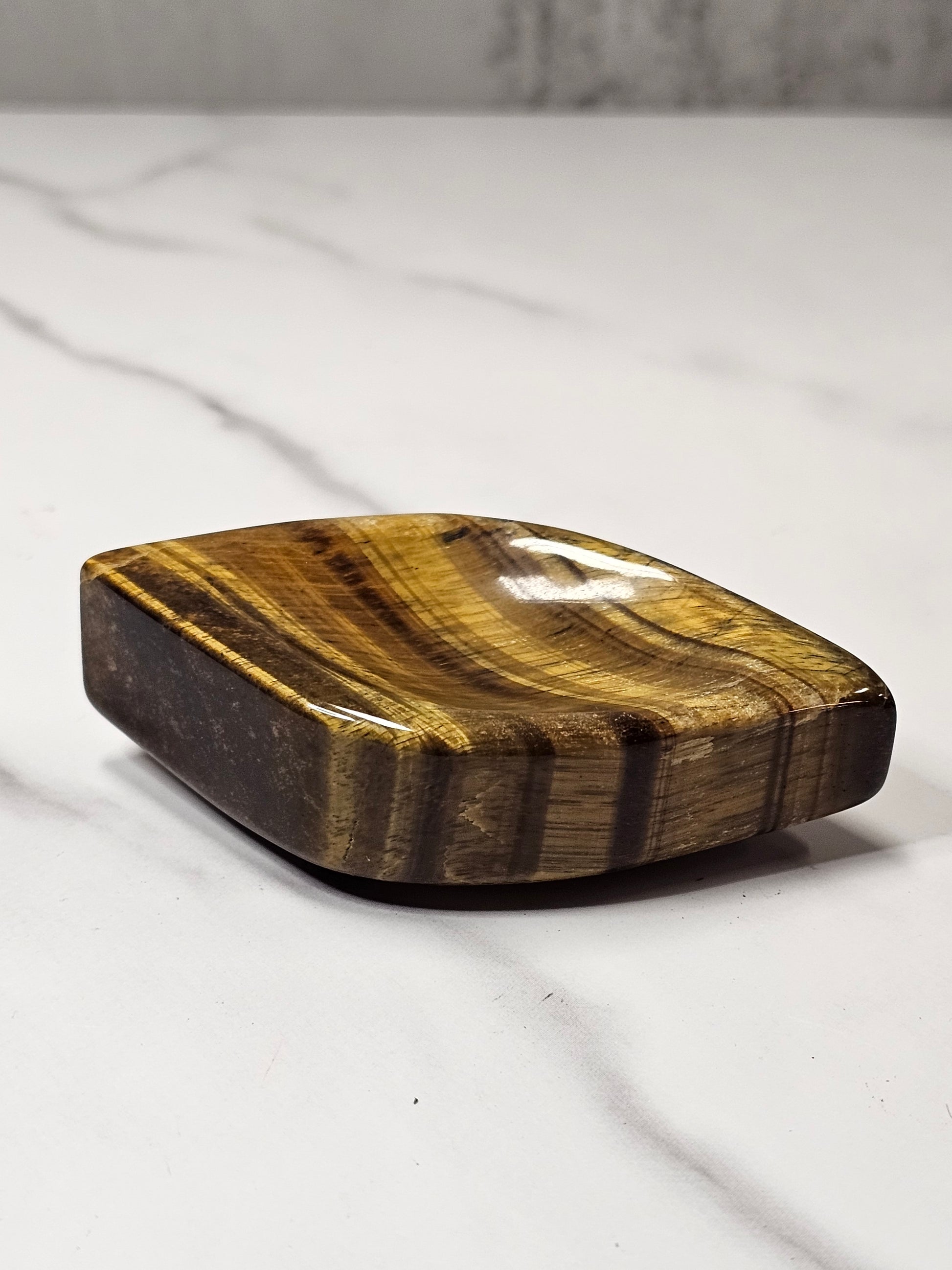 This Tiger's Eye bowl is 3.33 inches at the widest part and it is .87 inches deep. It has excellent high flash. The exact crystal bowl pictured is the one you will receive.
