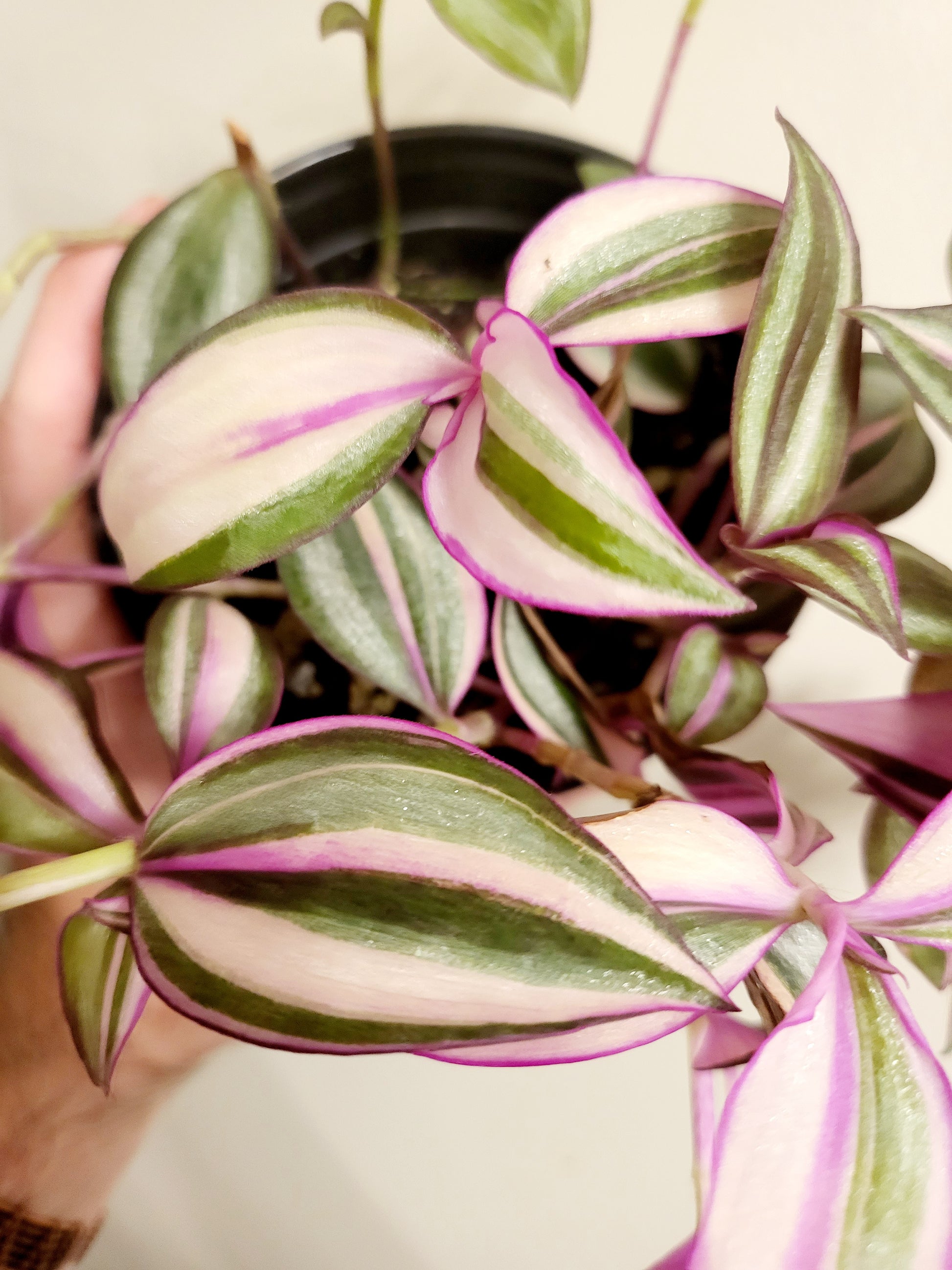This rare variety of Tradescantia features pink, purple, cream, and silvery hues! Each 4" nursery pot is fully established and sold growers choice very similar in size to the pictured one.
