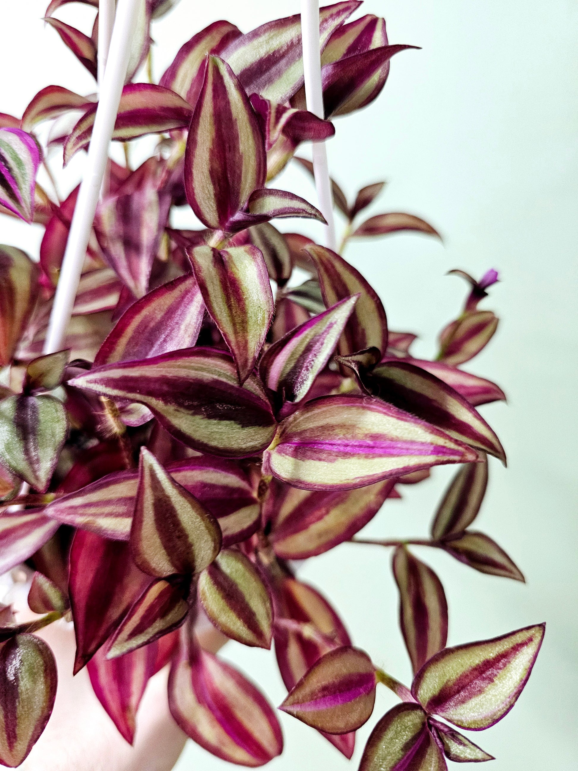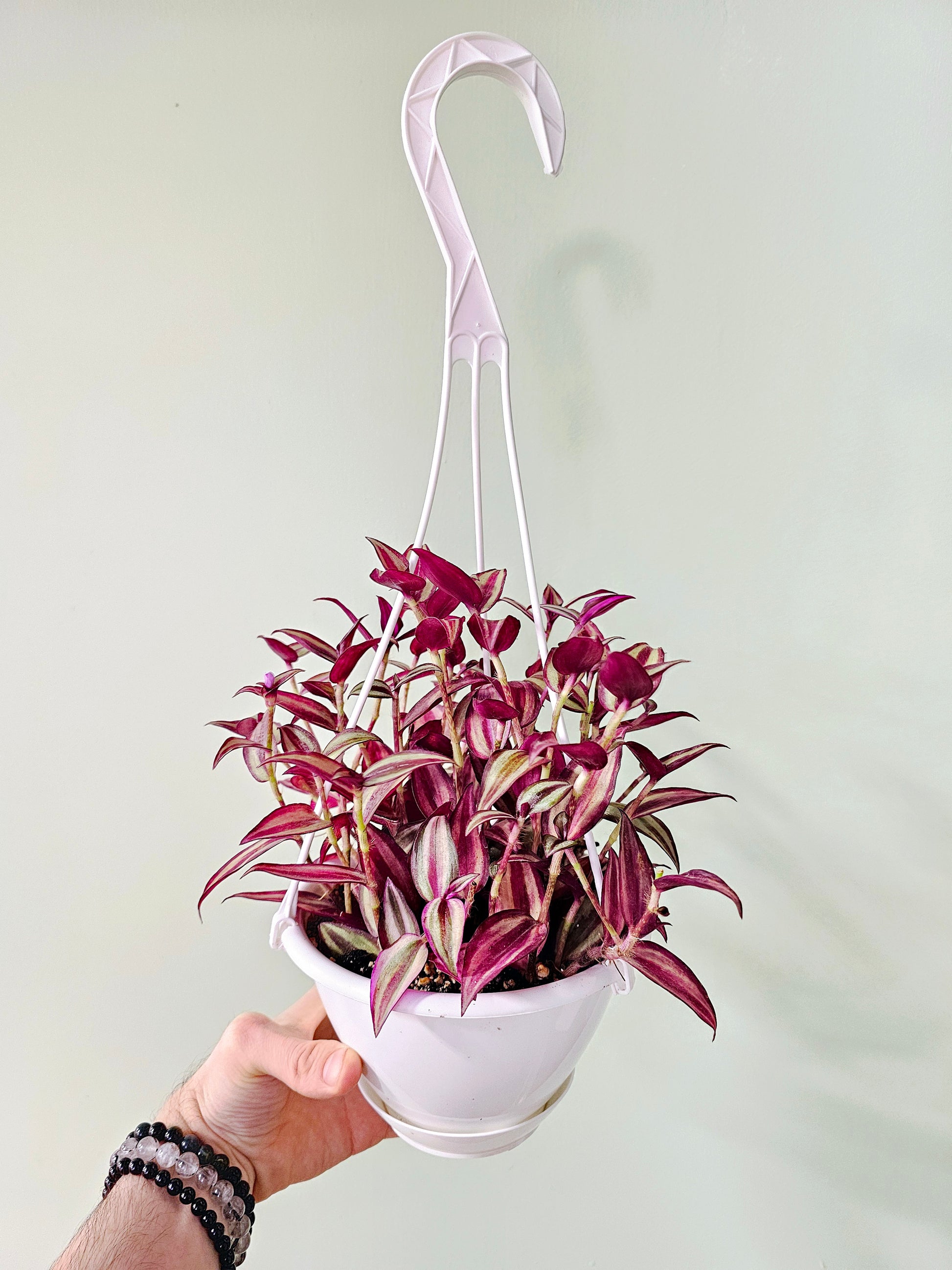 This rare variety of Tradescantia features pink, purple, cream, and silvery hues! Each basket is fully established and super full. These are growing in white plastic 6" hanging baskets with removeable saucers.