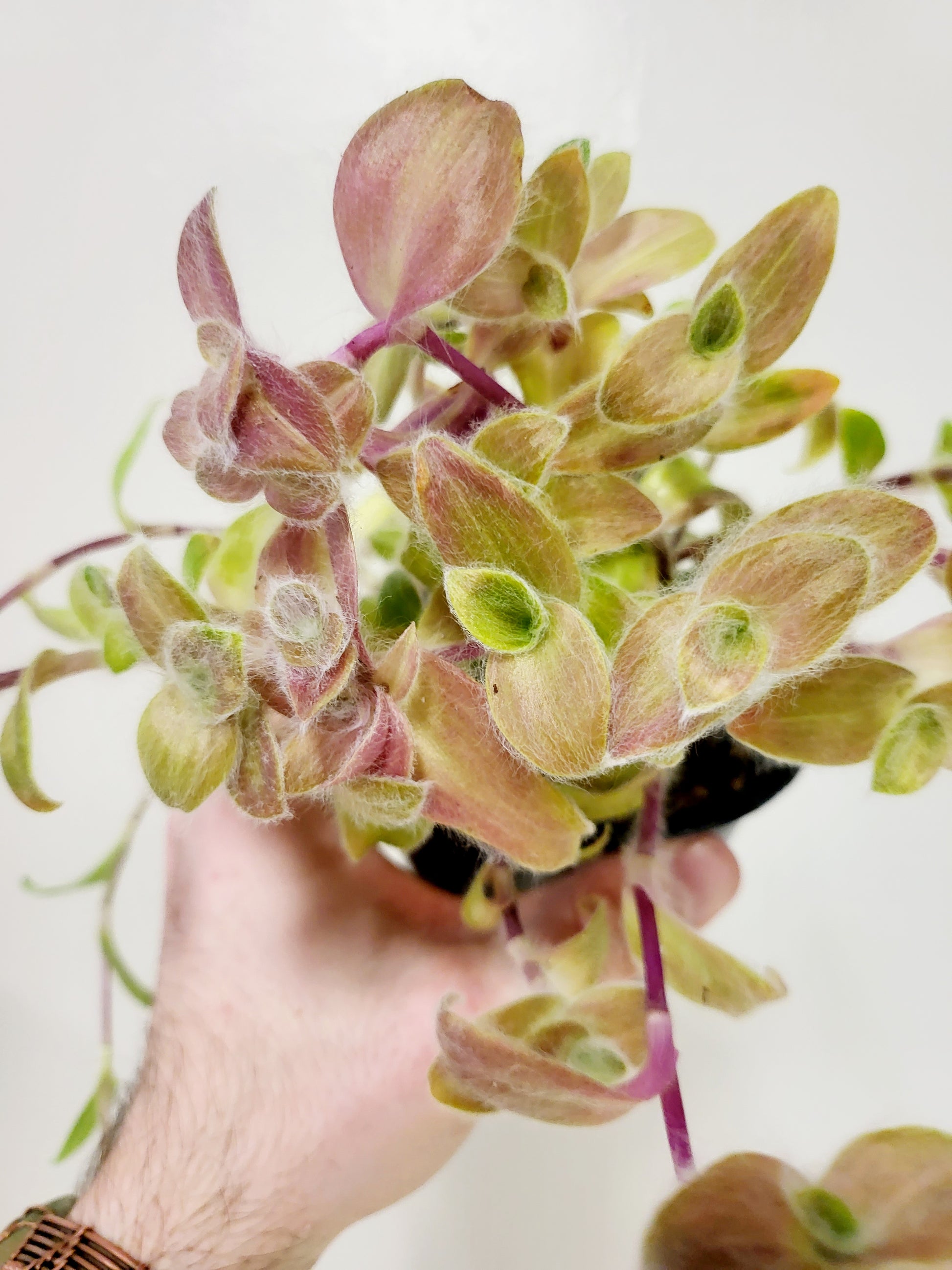 This unique Tradescantia species has super fuzzy and soft leaves! They are lightly sunstressed and will turn a pinkish purple. Each is sold grower's choice, fully rooted, in a 4" nursery pot.