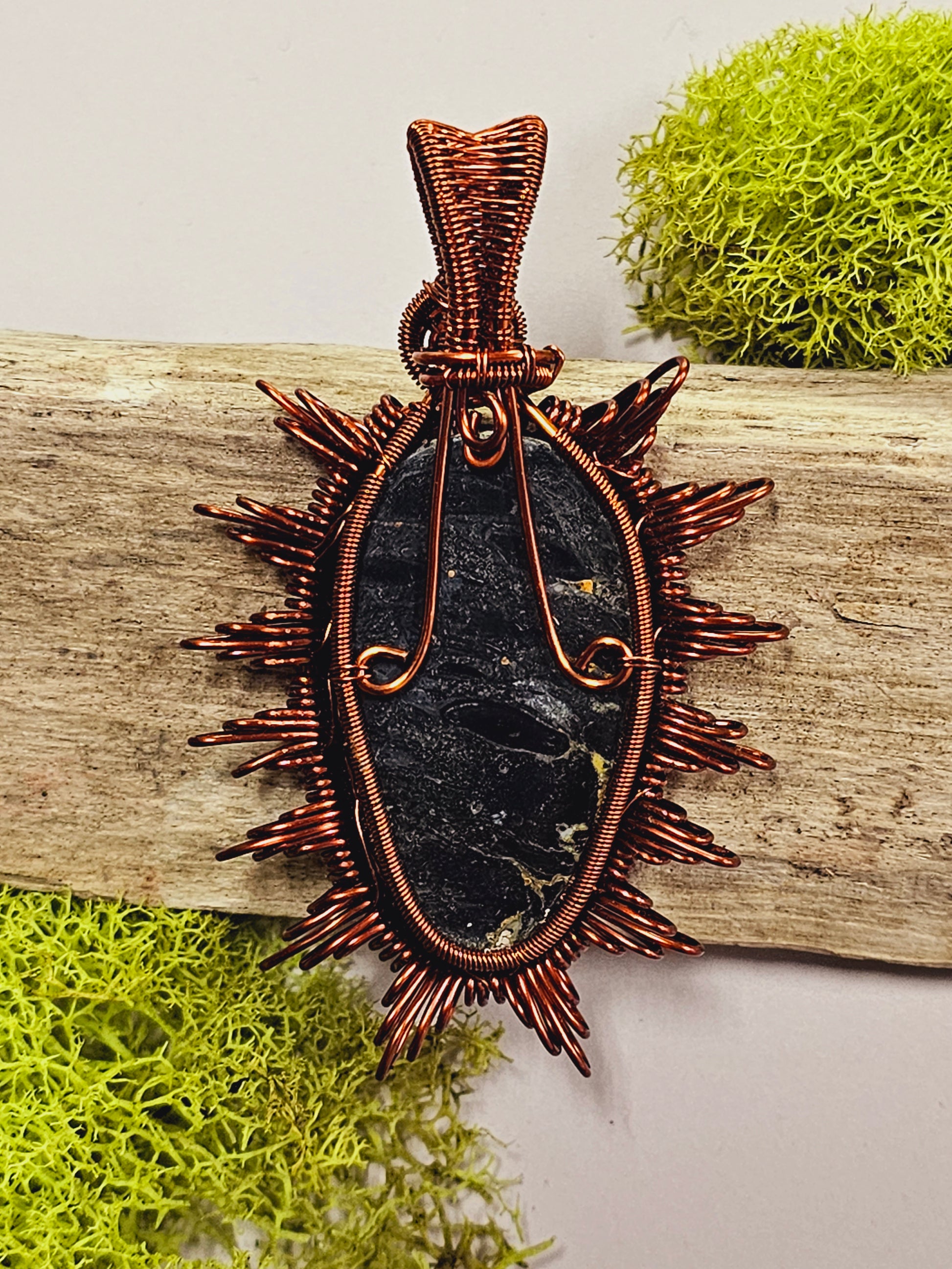 This handmade wire wrapped pendant comes on an 18" black cord with metal clasps.