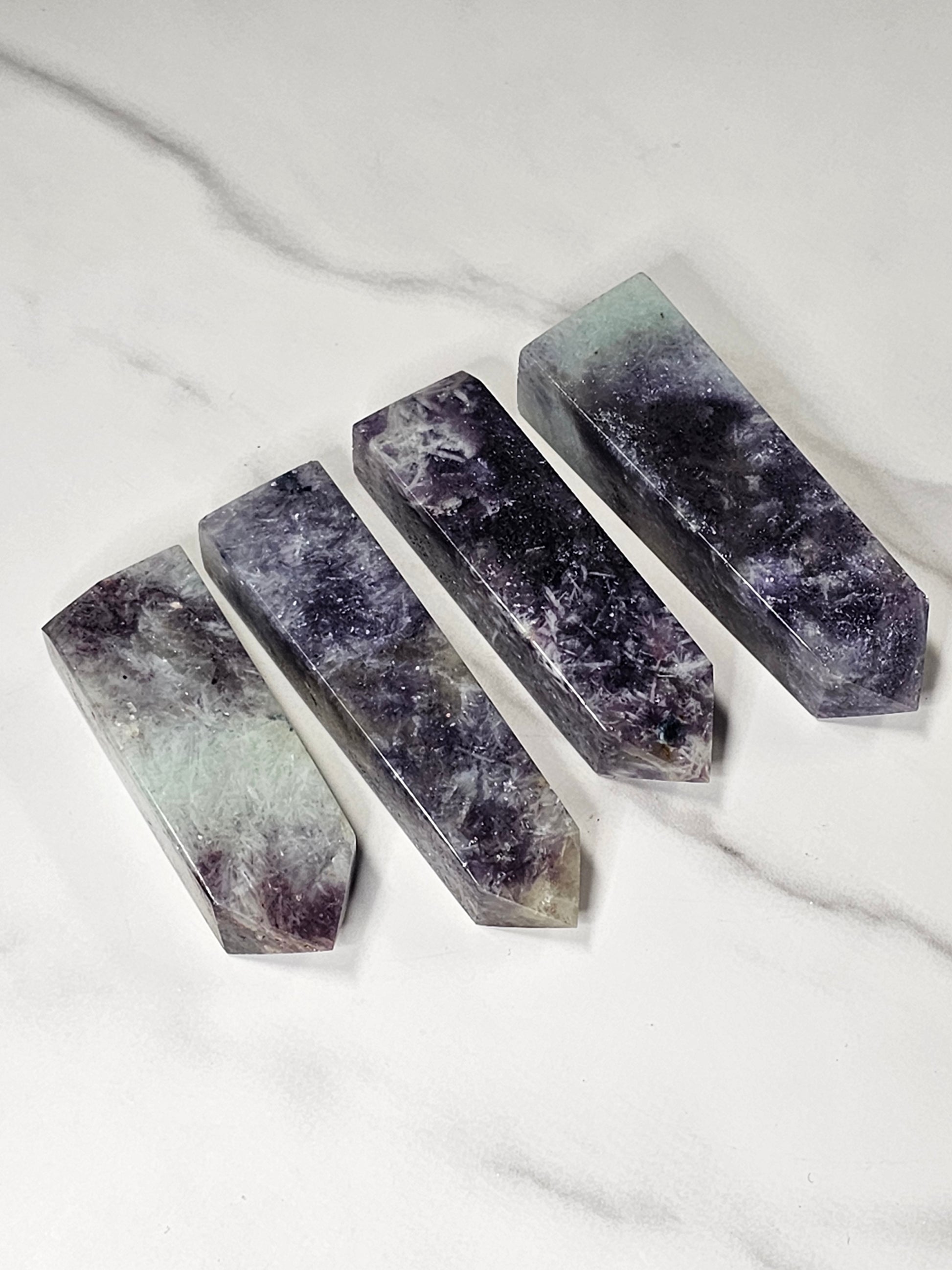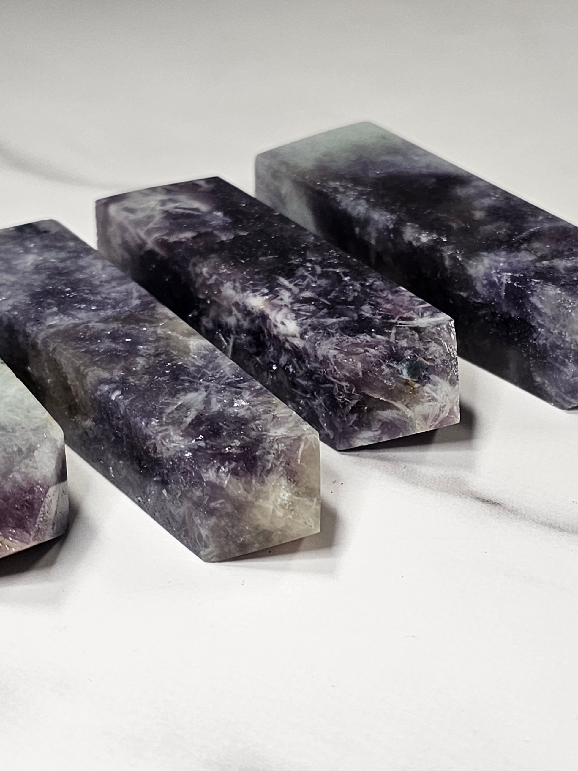 Unicorn stone is from Madagascar. It is the rare and perfect combination of Lepidolite, Pink Tourmaline, Quartz, and Clevelandite. Each tower is approximately 2.75-3.5 inches tall and sold curators choice at random.