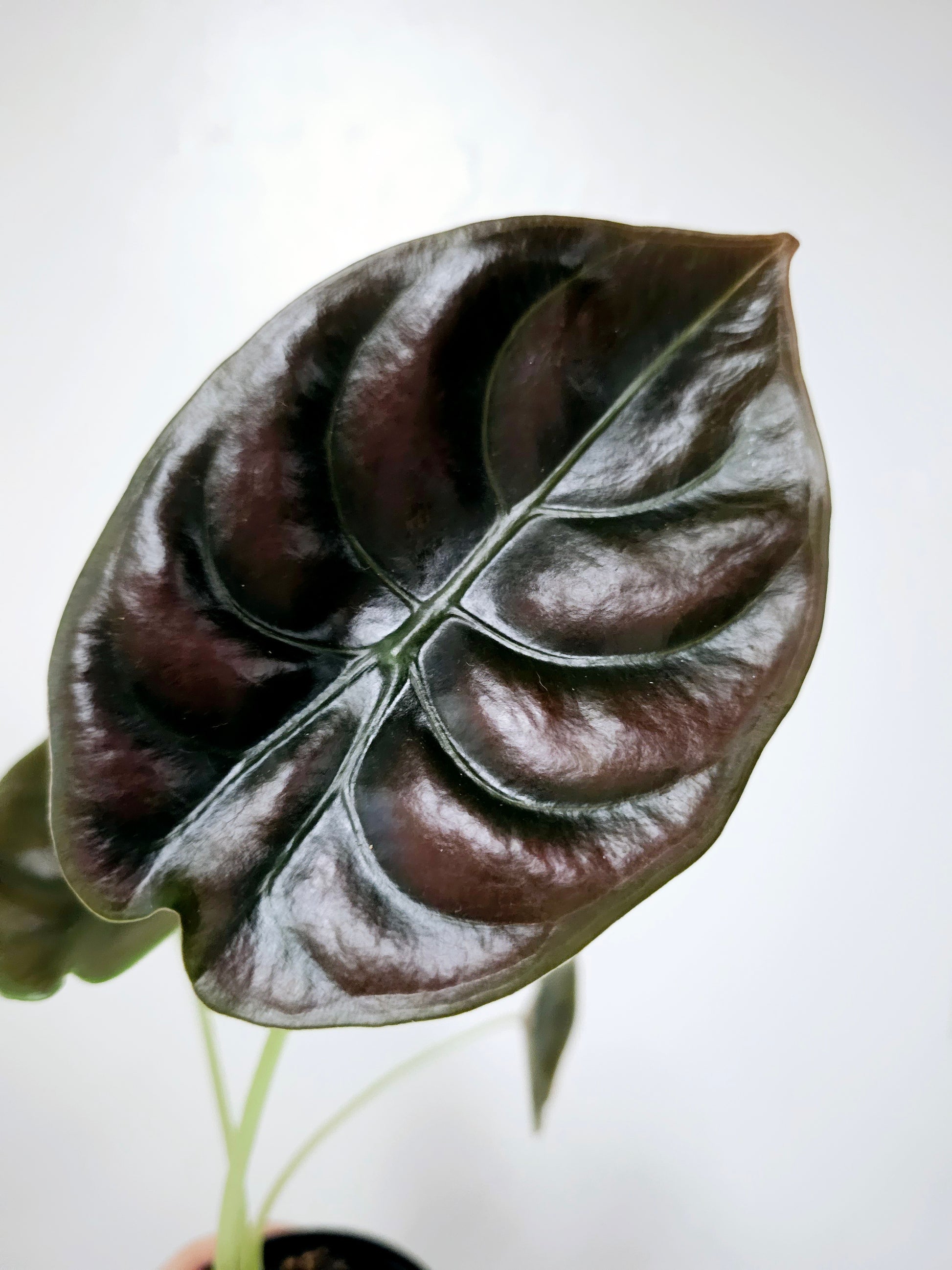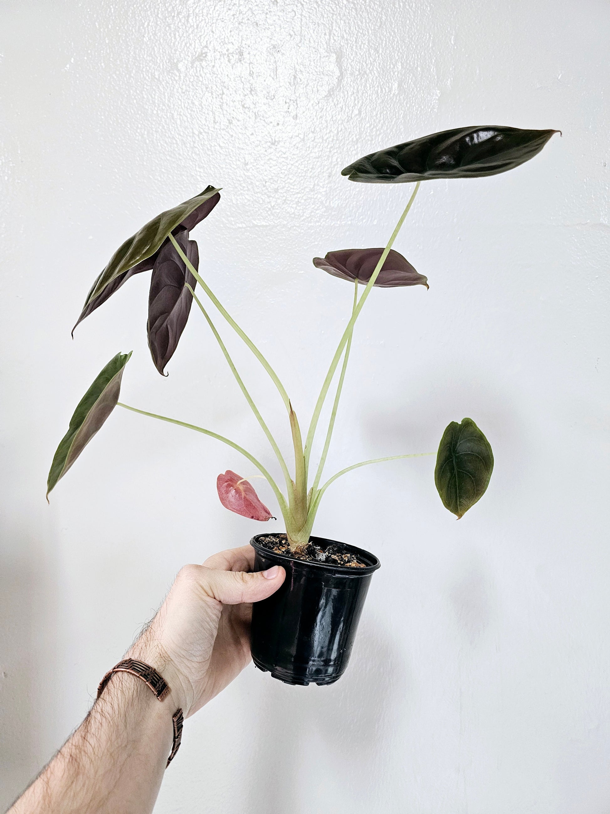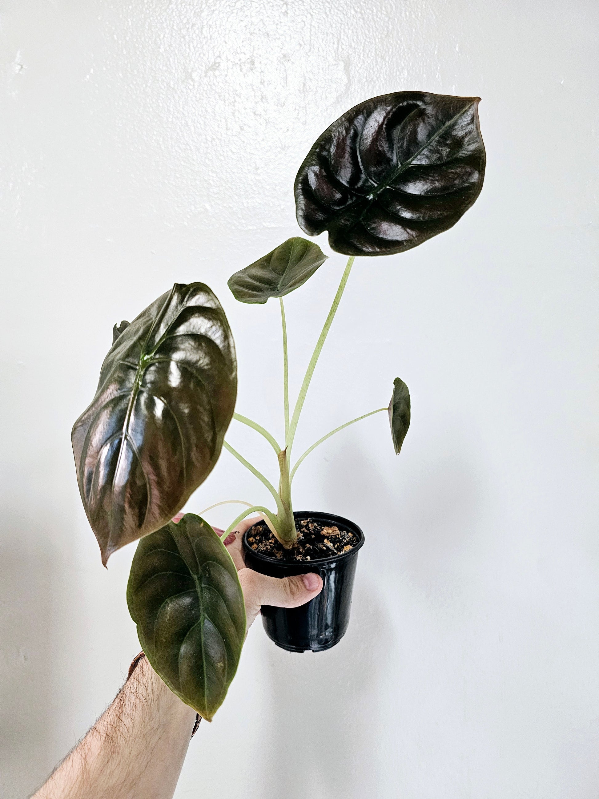 These Alocasia have very dark, almost black leaves with a red sheen. They are growing in 4" nursery pots and will be shipped grower's choice, similar to the one pictured. They have sized up nicely and have really pretty leaves.