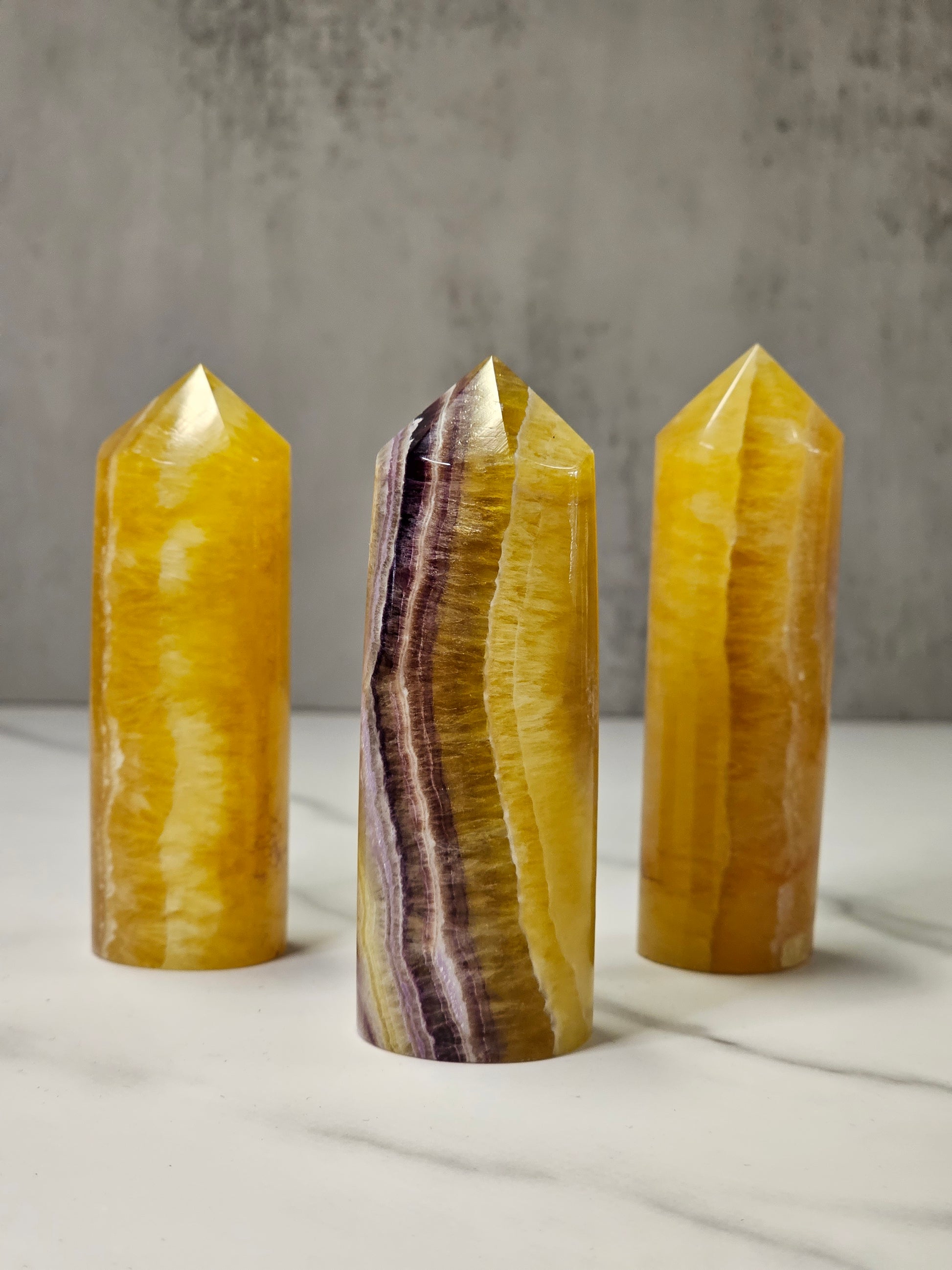 These Yellow Fluorite cylinder towers are super vibrant and come in hues from a light yellow with red, to a golden color. Each one is unique. Each tower is approximately 3.25-3.75 inches tall.