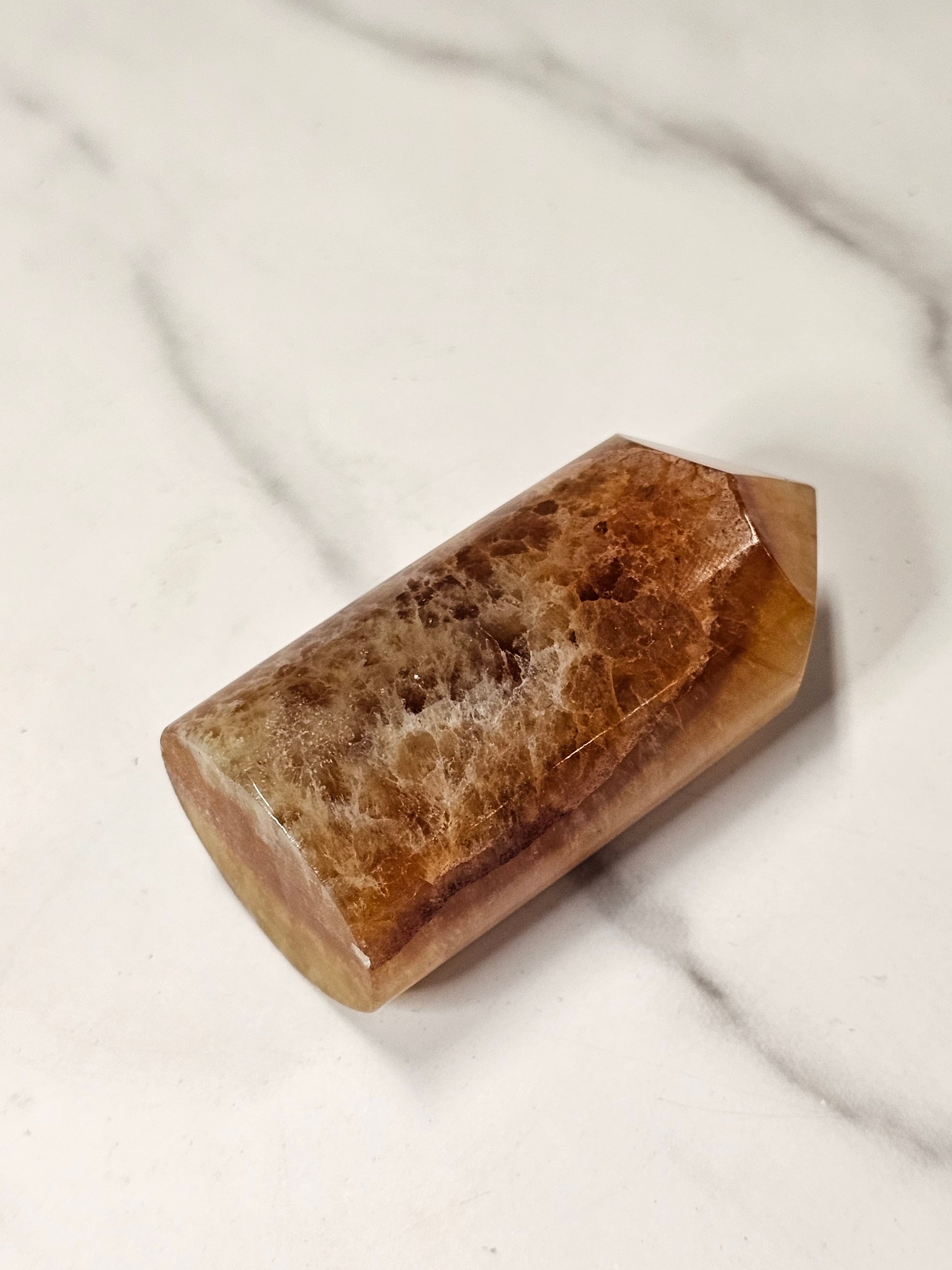 The Yellow Fluorite tower is cut and polished in a cylinder shape. It has a deep golden hue. It is 2.57 inches tall.