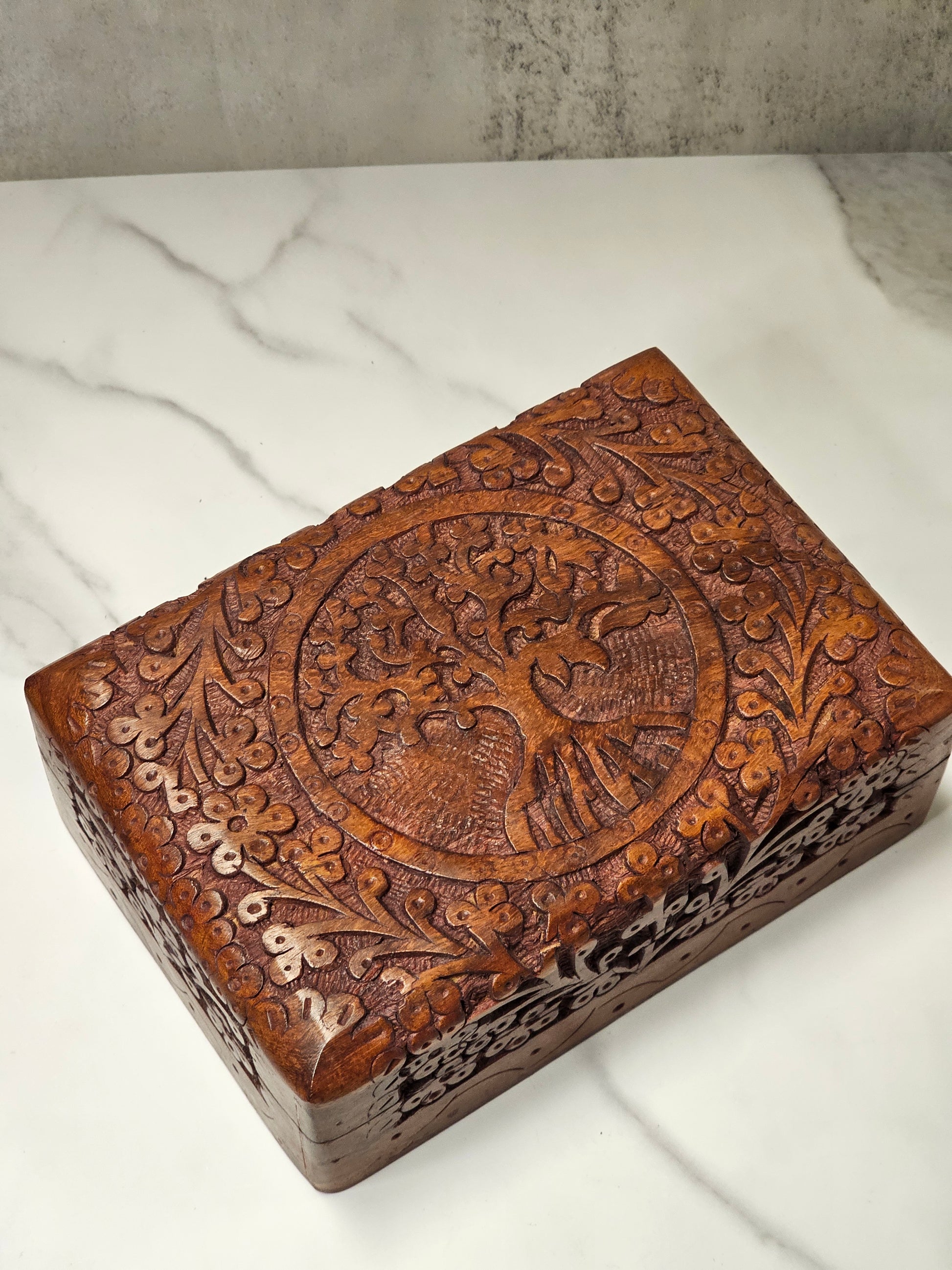 These wooden boxes are hand carved with lots of intricate detail and design. Each box is 7.25 inches long, 5 inches wide, and 2.75 inches tall.