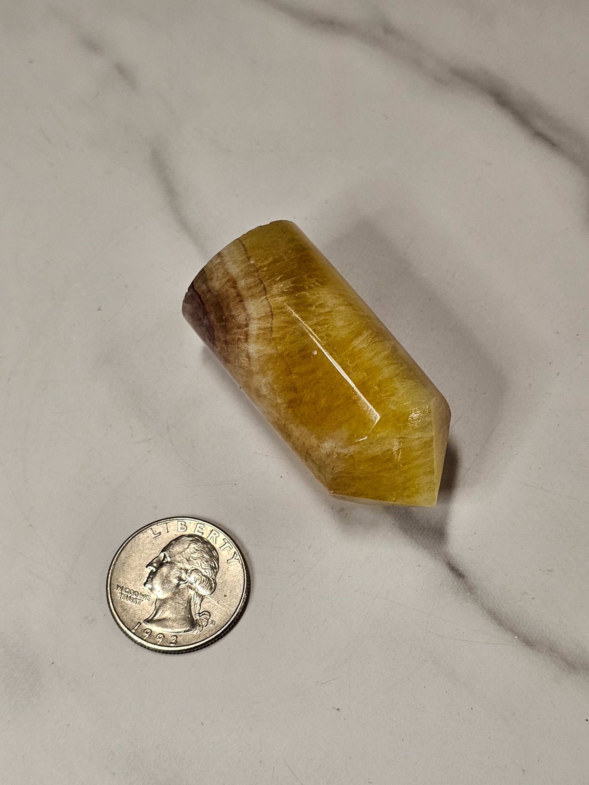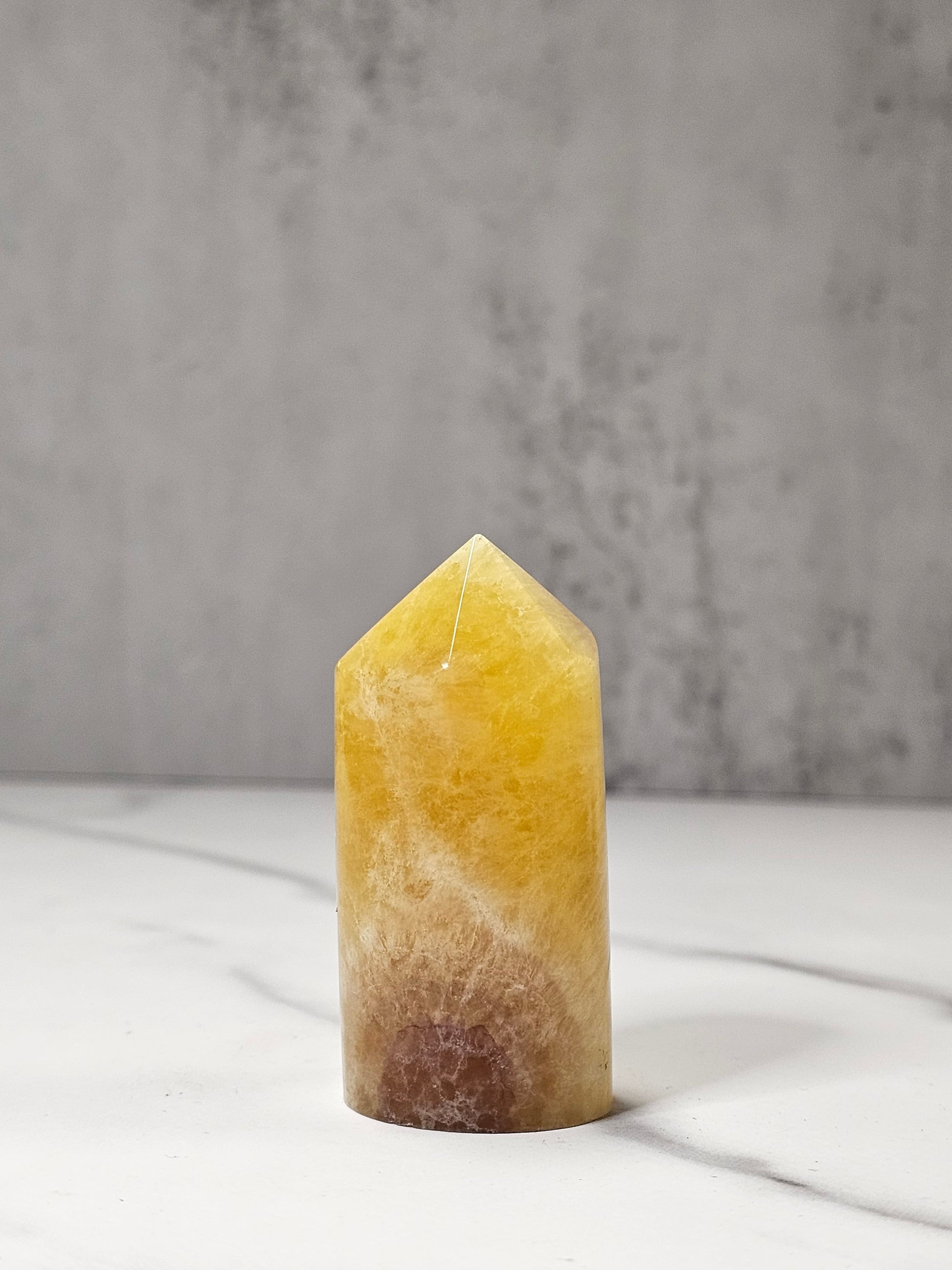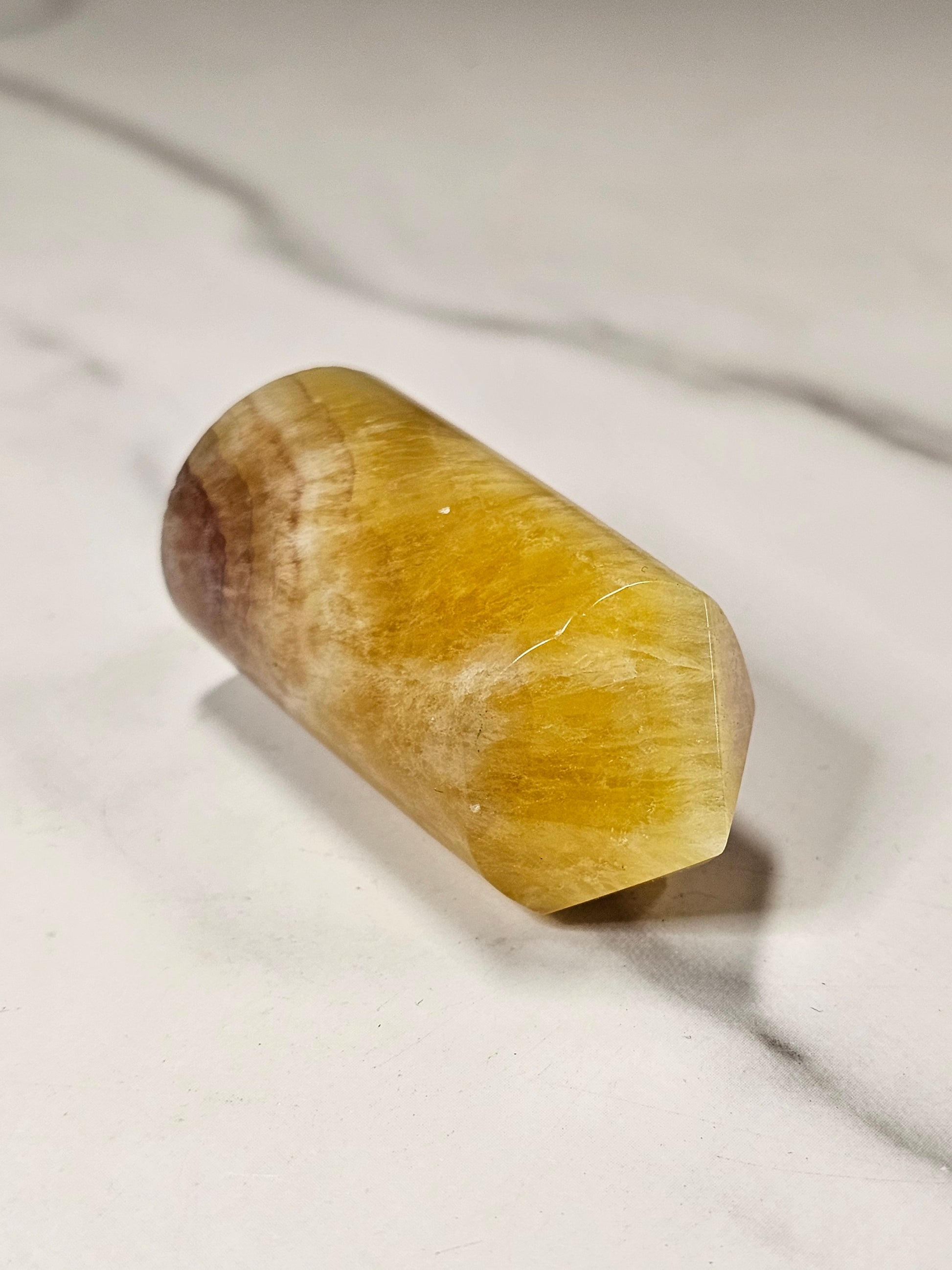 The Yellow Fluorite tower is cut and polished in a cylinder shape. It has a bright yellow hue. It is 2.25 inches tall.