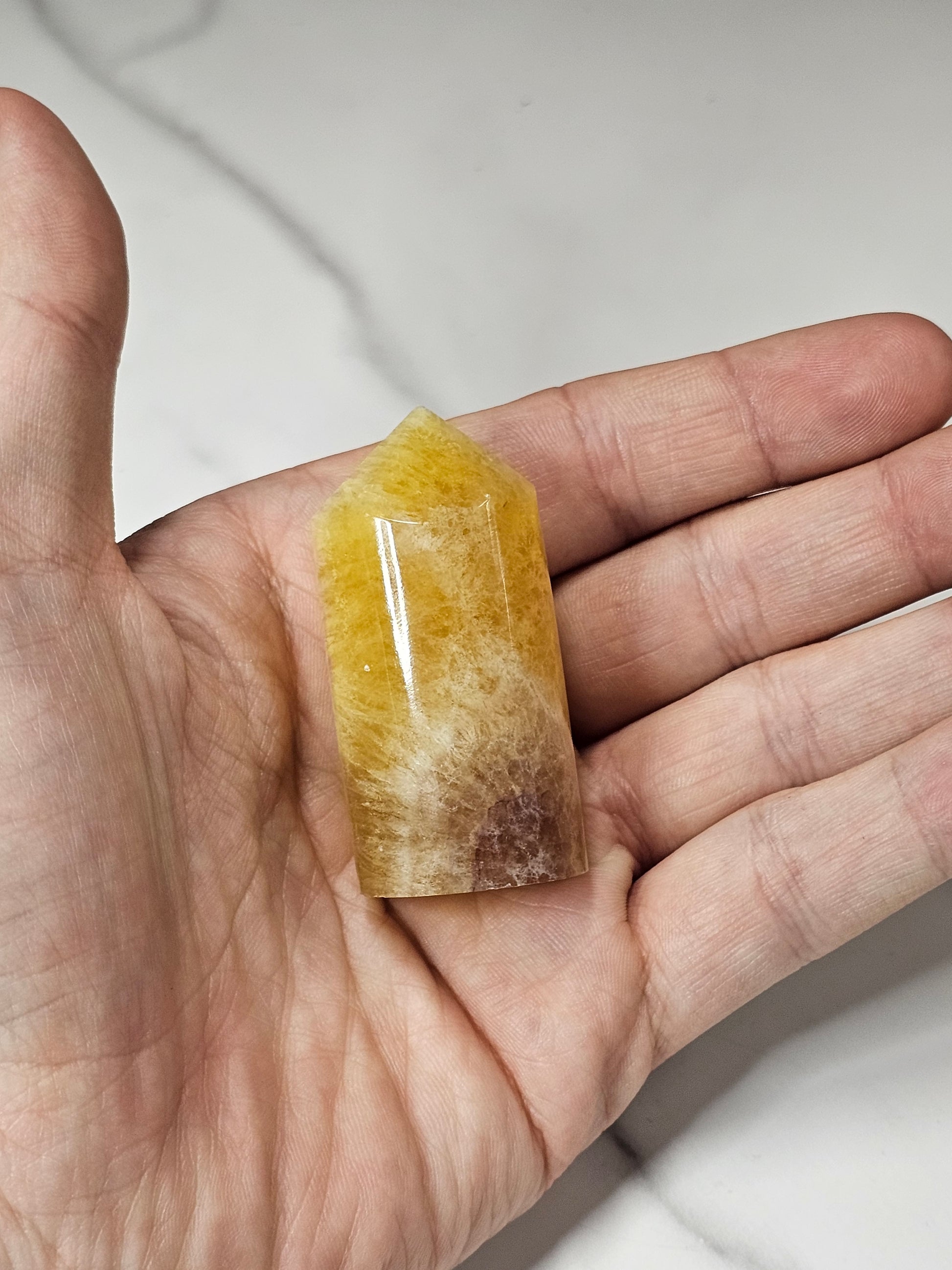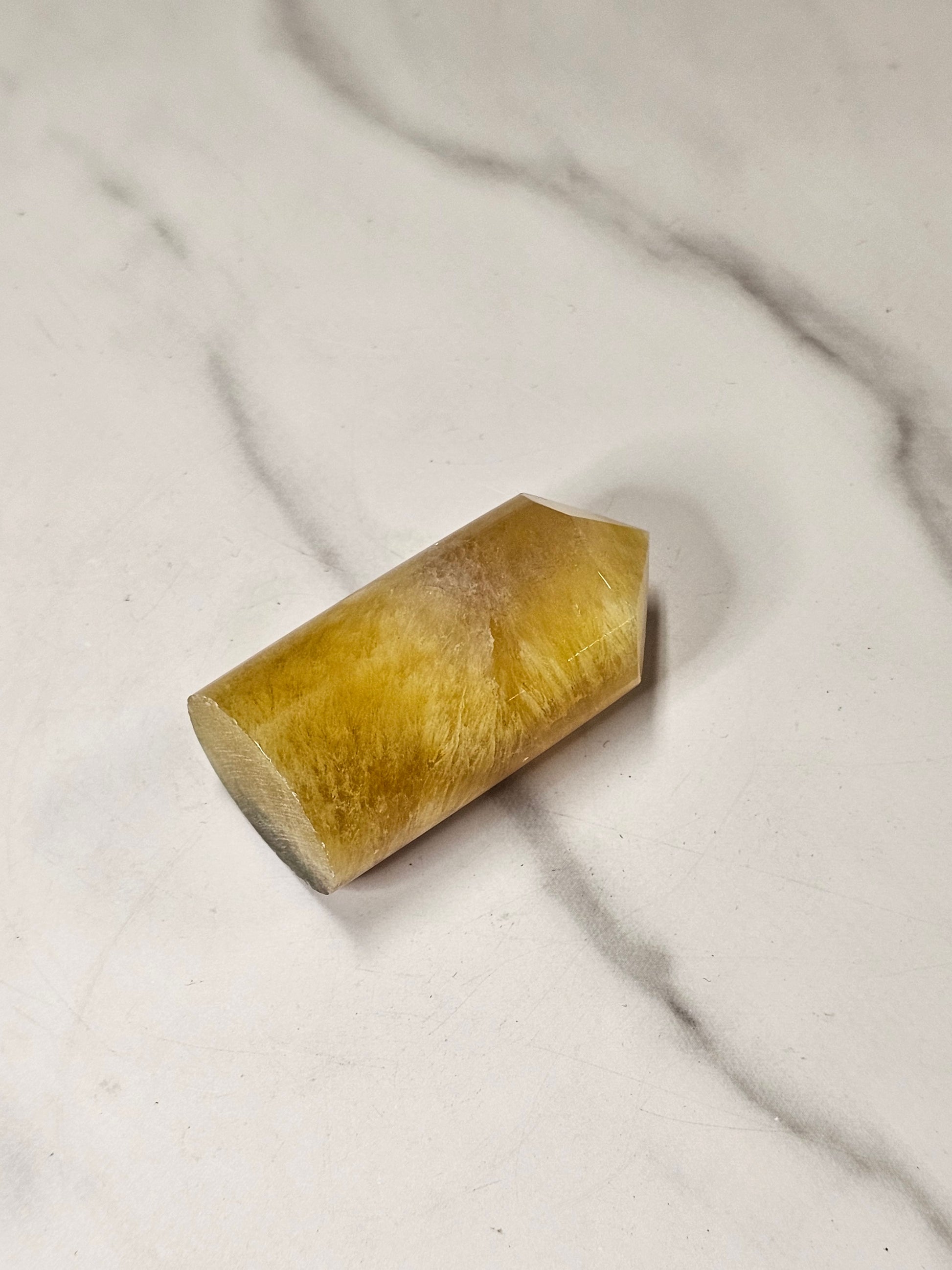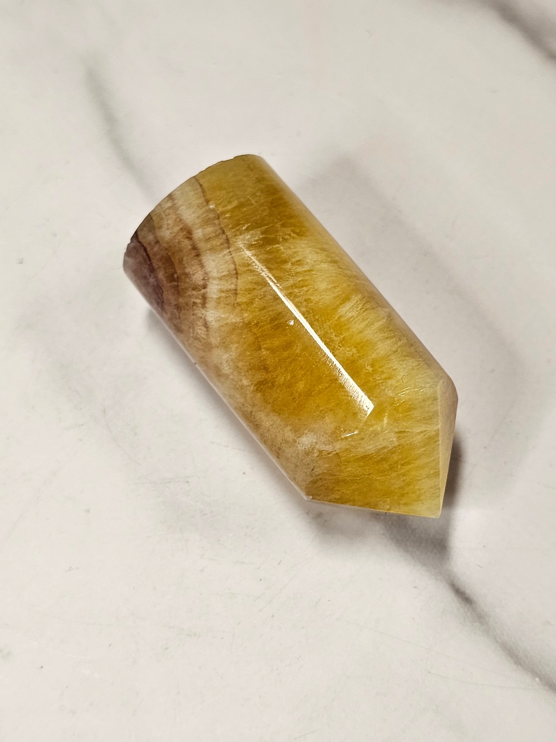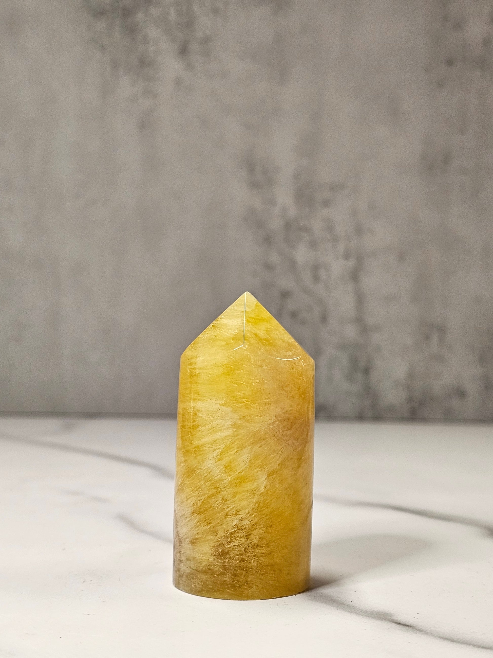The Yellow Fluorite tower is cut and polished in a cylinder shape. It has a bright yellow hue. It is 2.25 inches tall.
