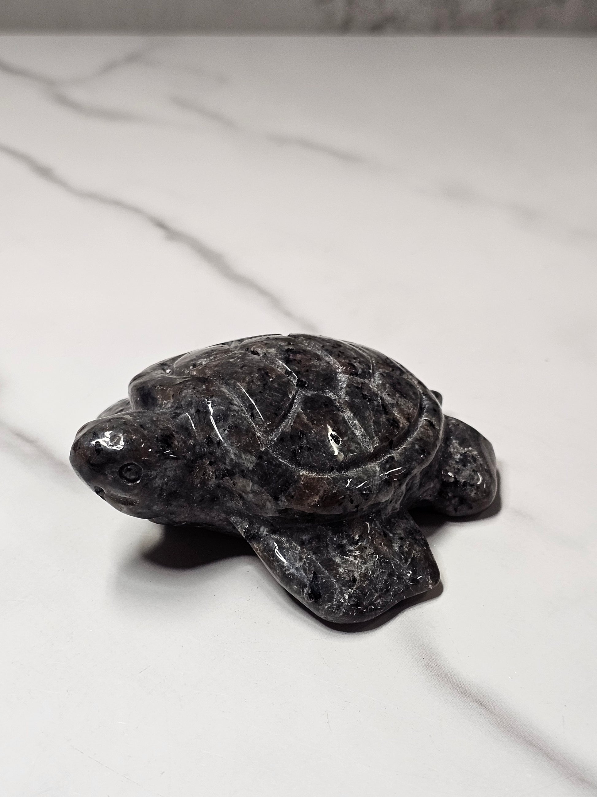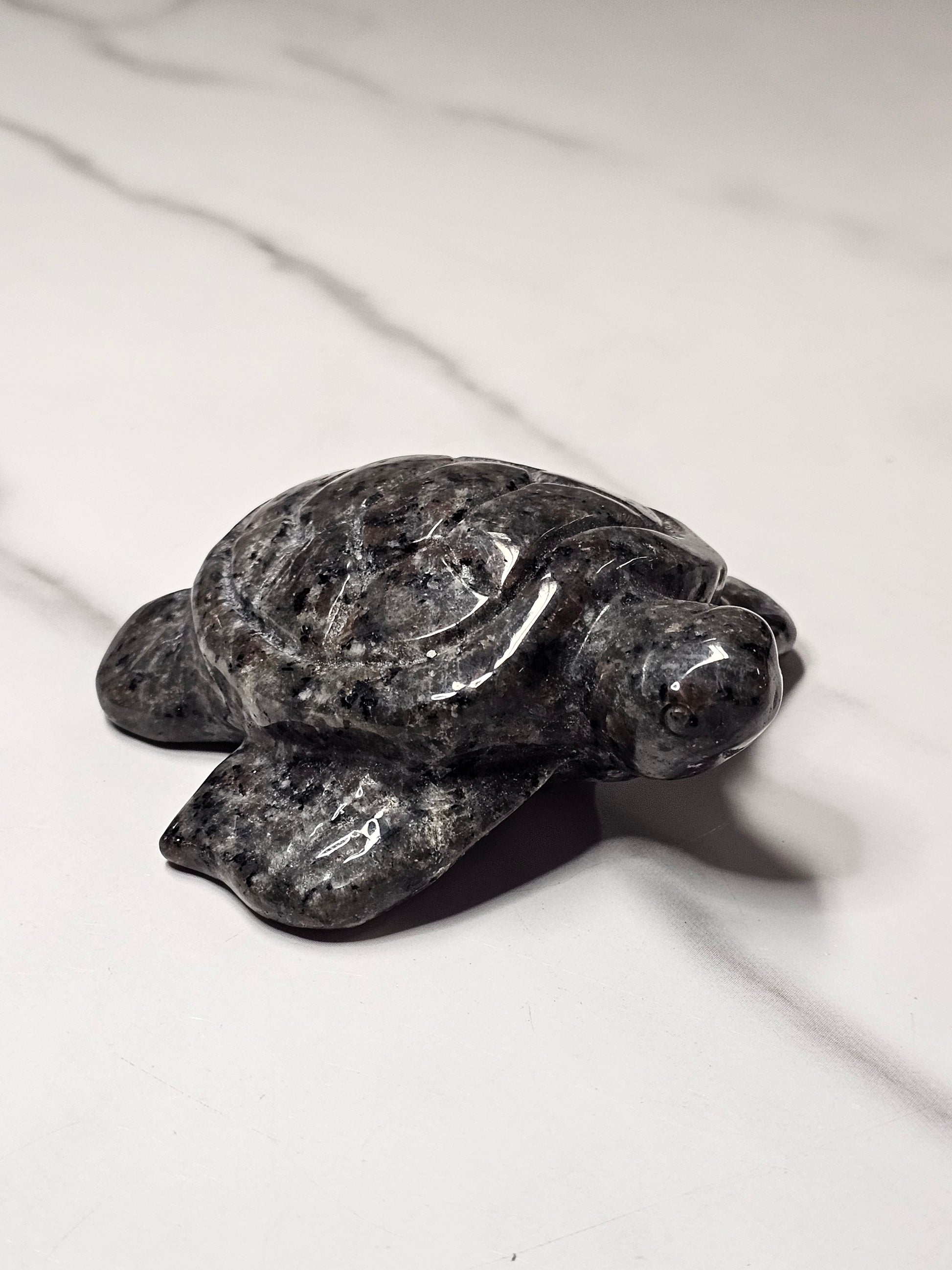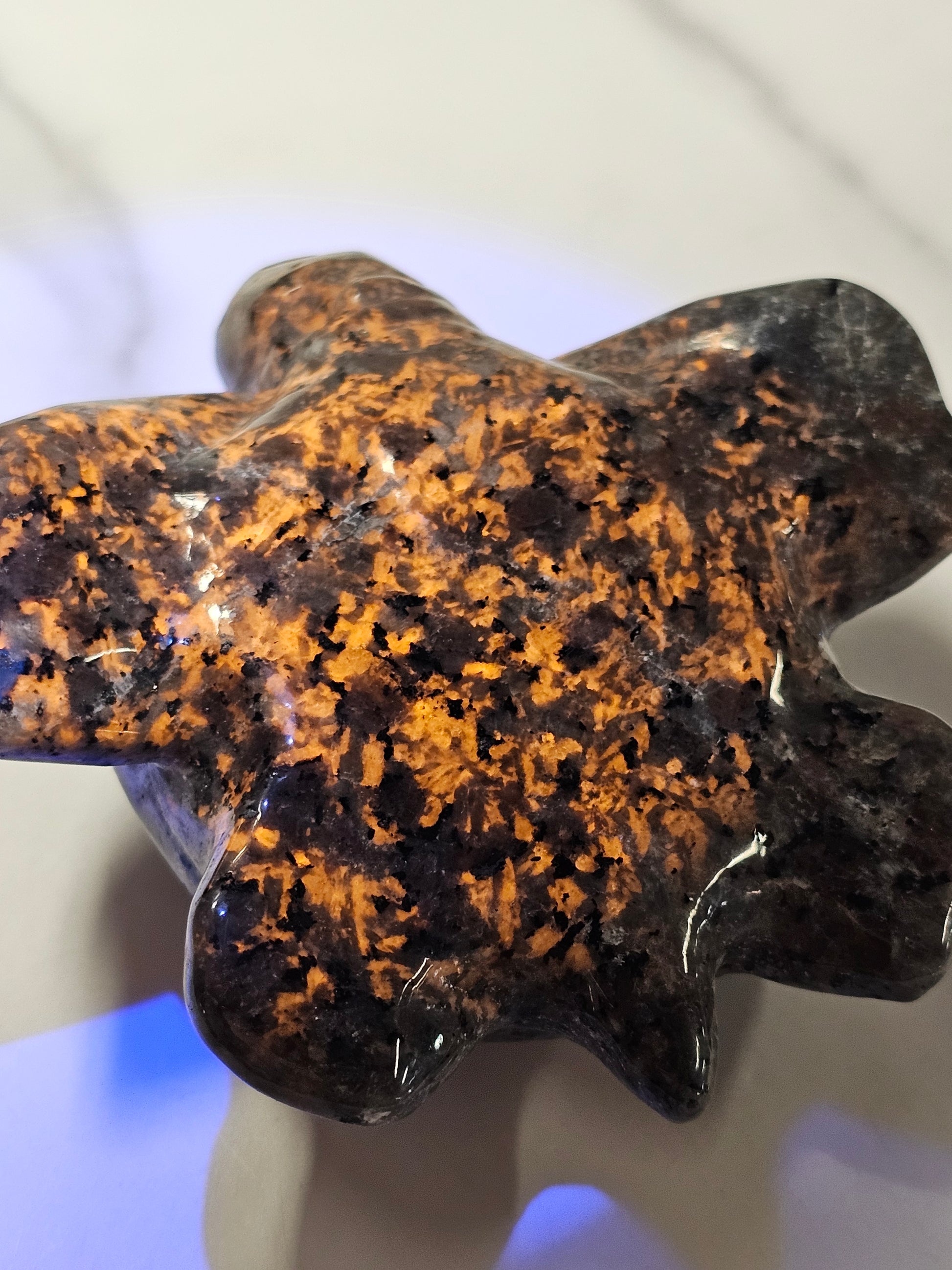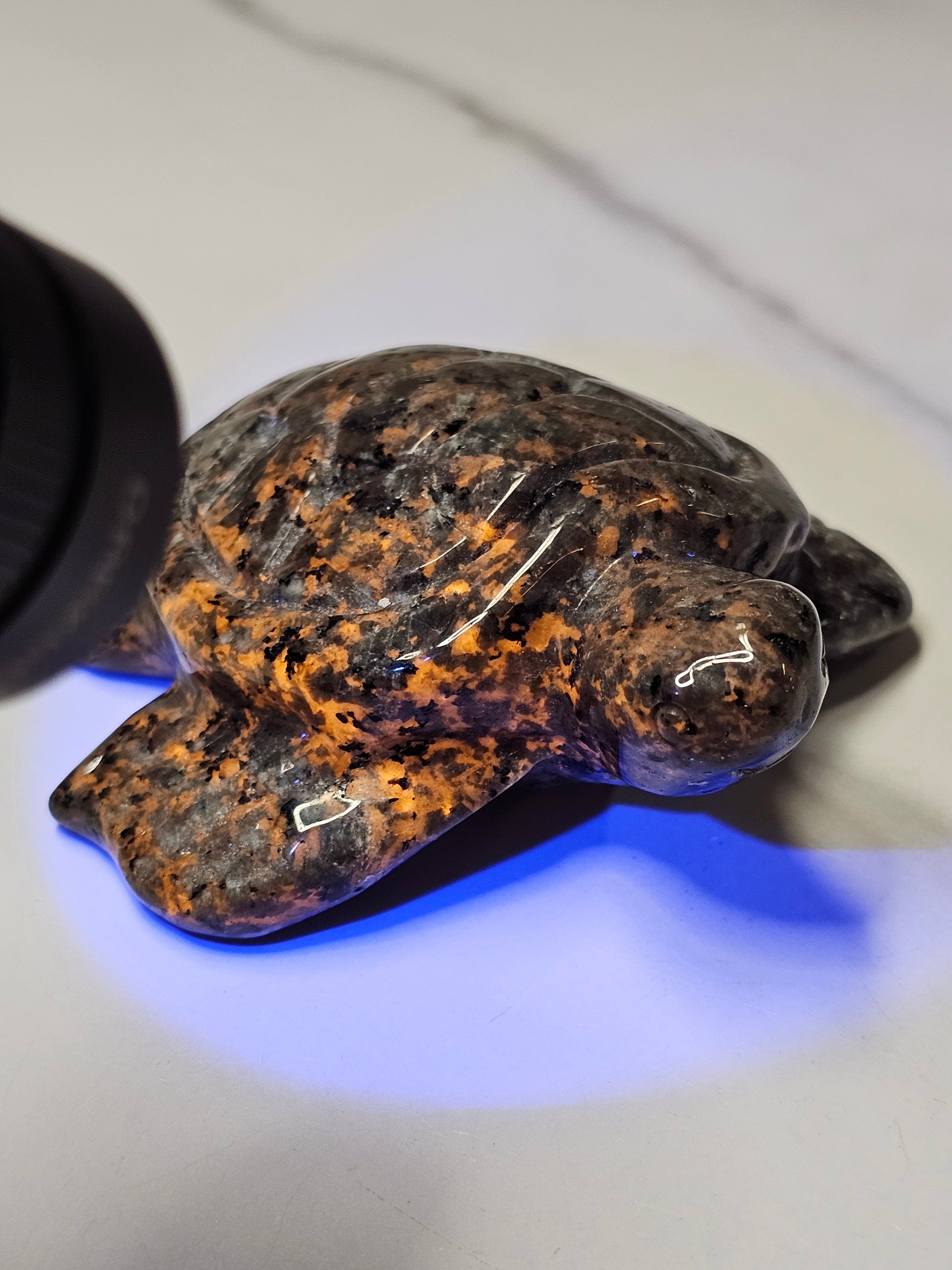 This sea turtle carving is made from Yooperlite. It has good UV orange fluorescence as seen in the photos. It is 3.26 inches long and 2.99 inches wide.