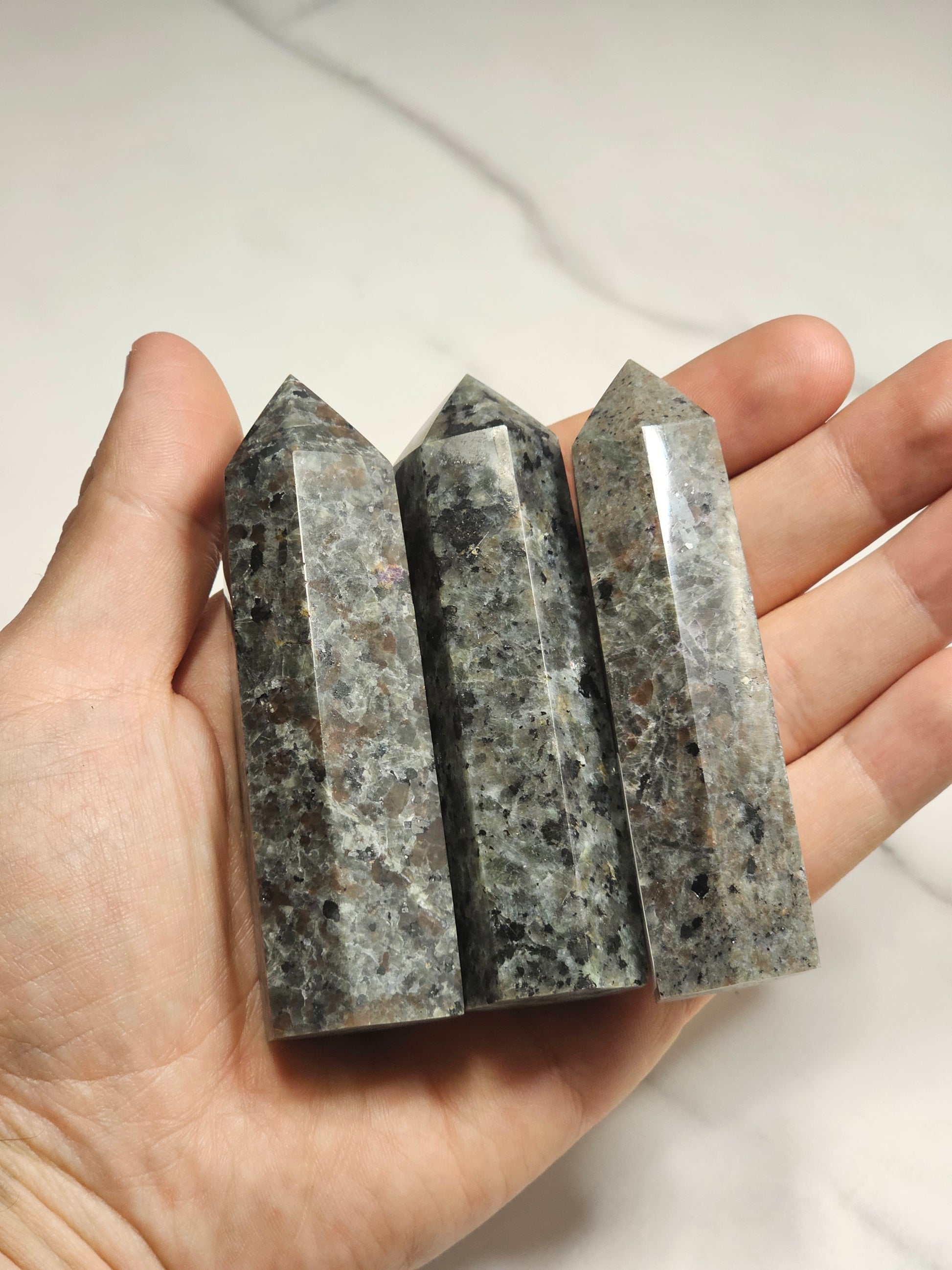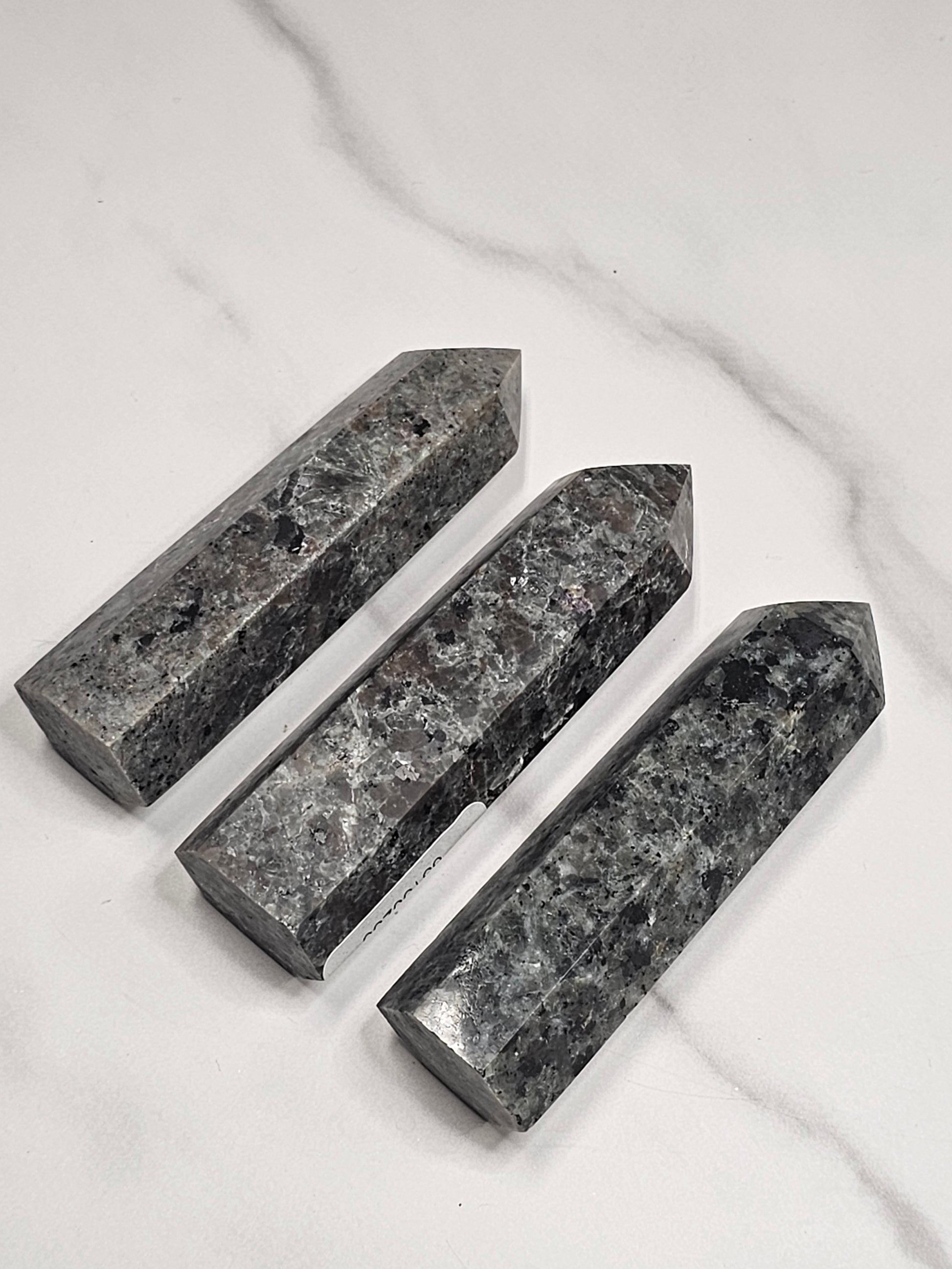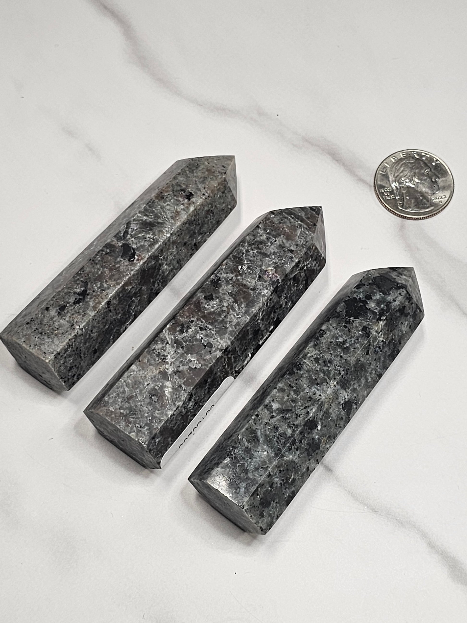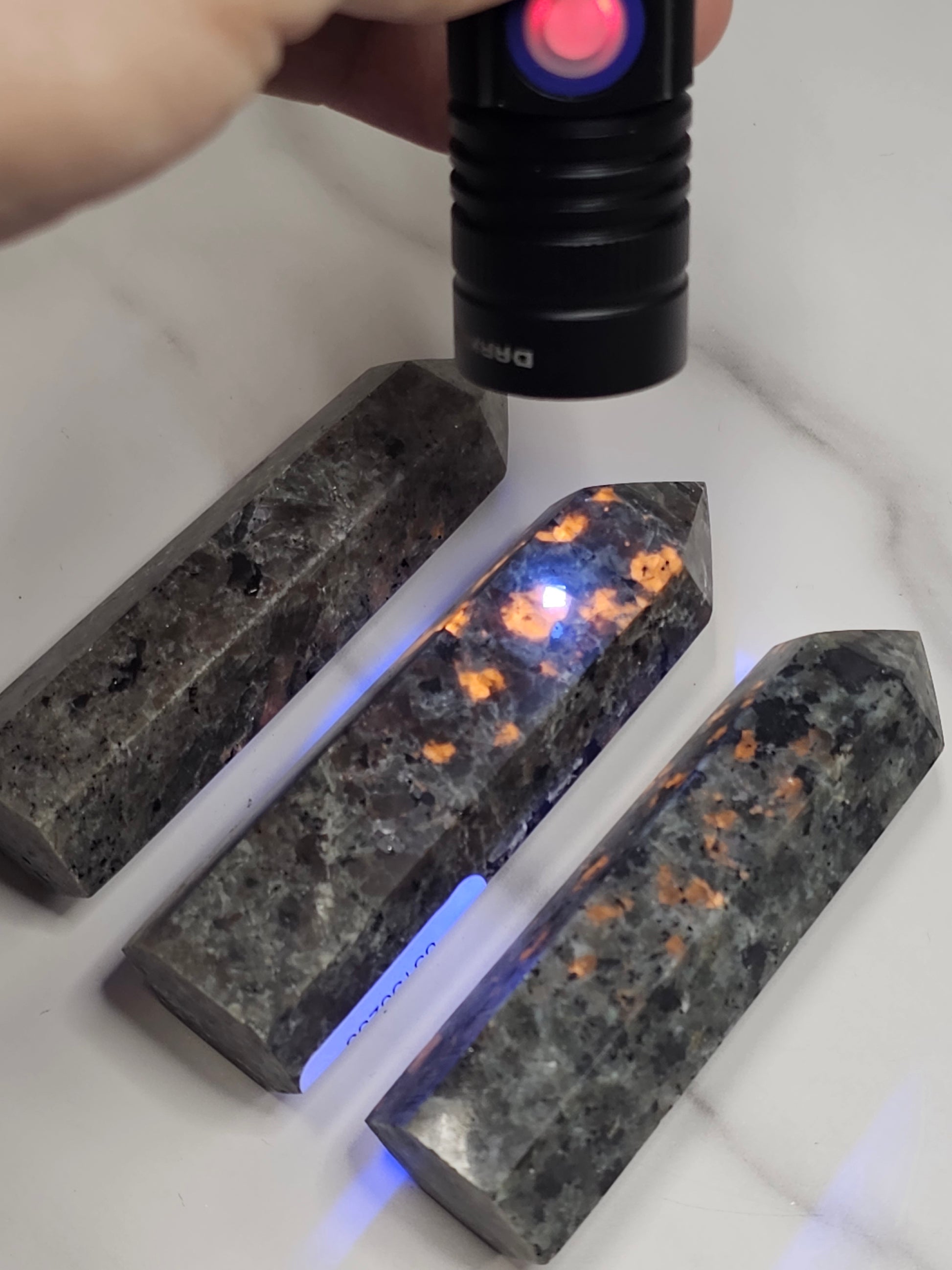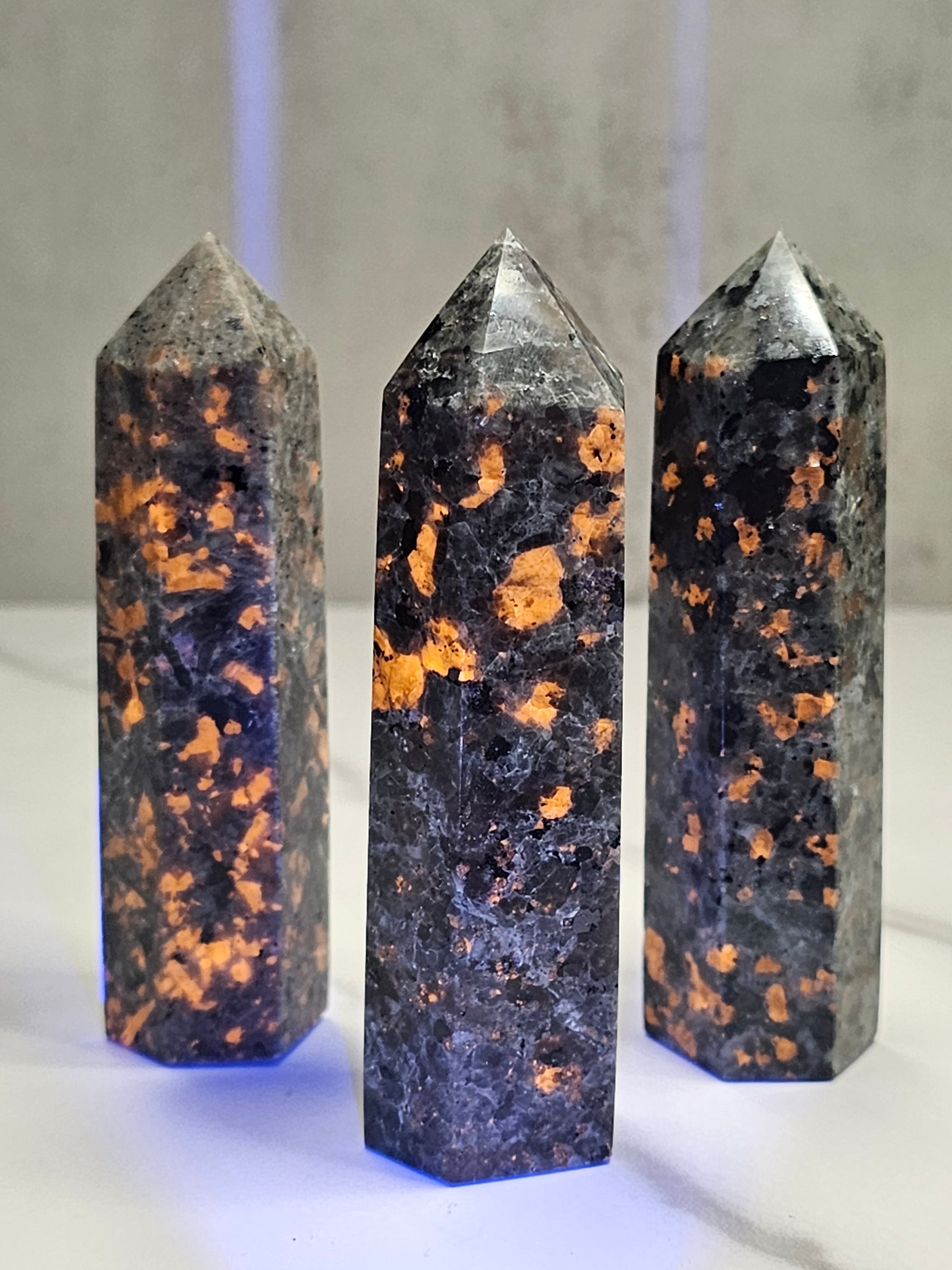 These Yooperlite towers are approximately 3.5-4 inches tall. Yooperlite fluoresces a bright orange color under UV light as seen in the first photo, it's pretty cool! Each one is sent curators choice at random.