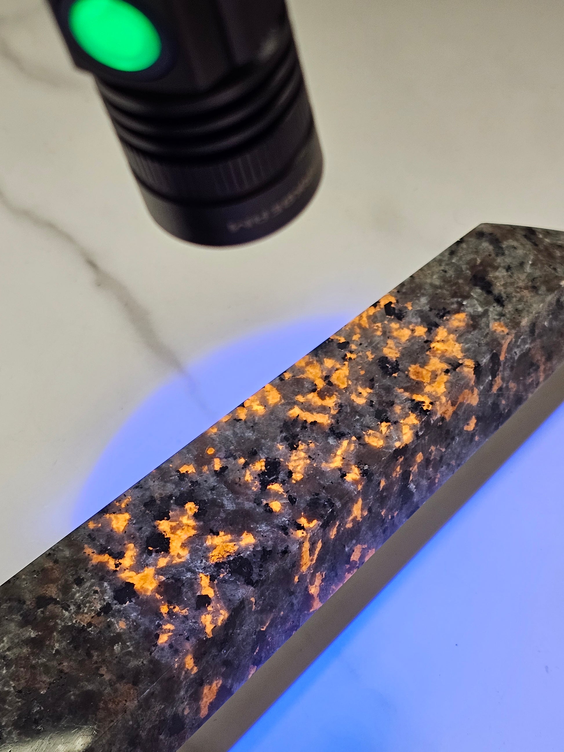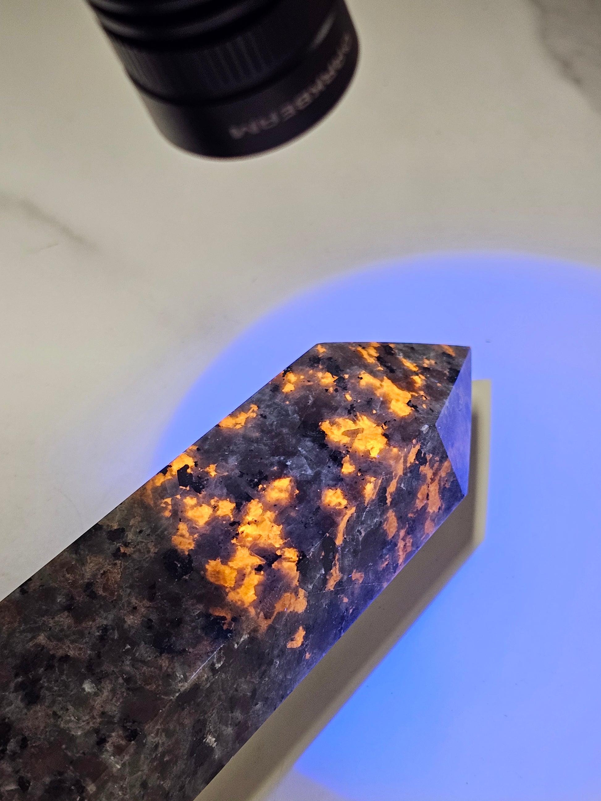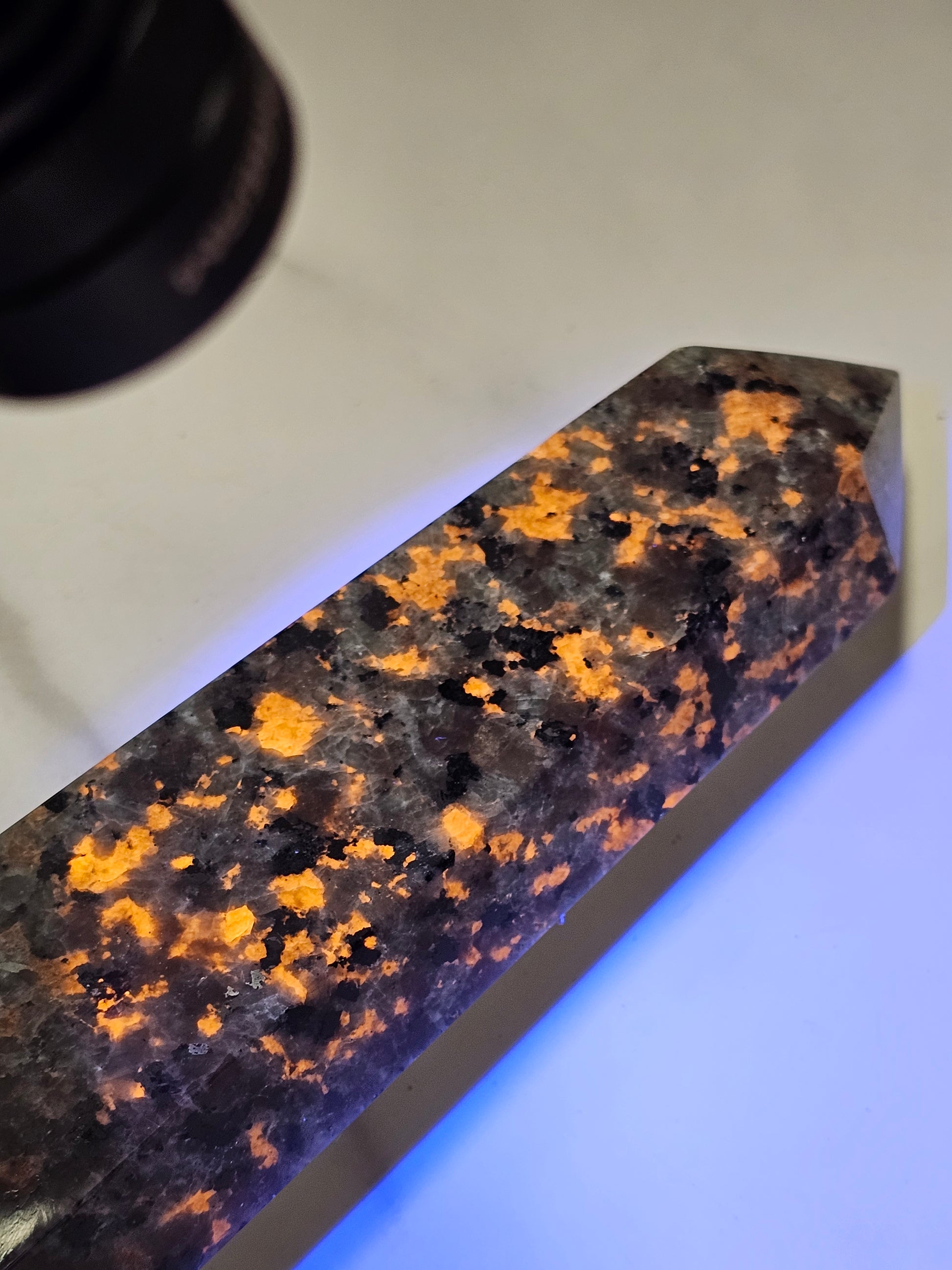 This large Yooperlite tower fluoresces a bright vibrant orange color under UV light and almost looks like it is on fire! This tower stands tall at 7.8 inches tall and 1.99 inches wide at the base. It weighs 18.5 ounces. The exact tower pictured is the one you will receive.